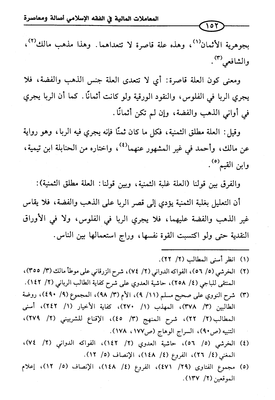 ومعنى كون العلة قاصرة: أي لا تتعدى العلة جنس الذهب والفضة، فلا يجري الربا في الفلوس، والنقود الورقية ولو كانت أثمانًا. كما أن الربا يجري في أواني الذهب والفضة، وإن لم تكن أثمانًا.