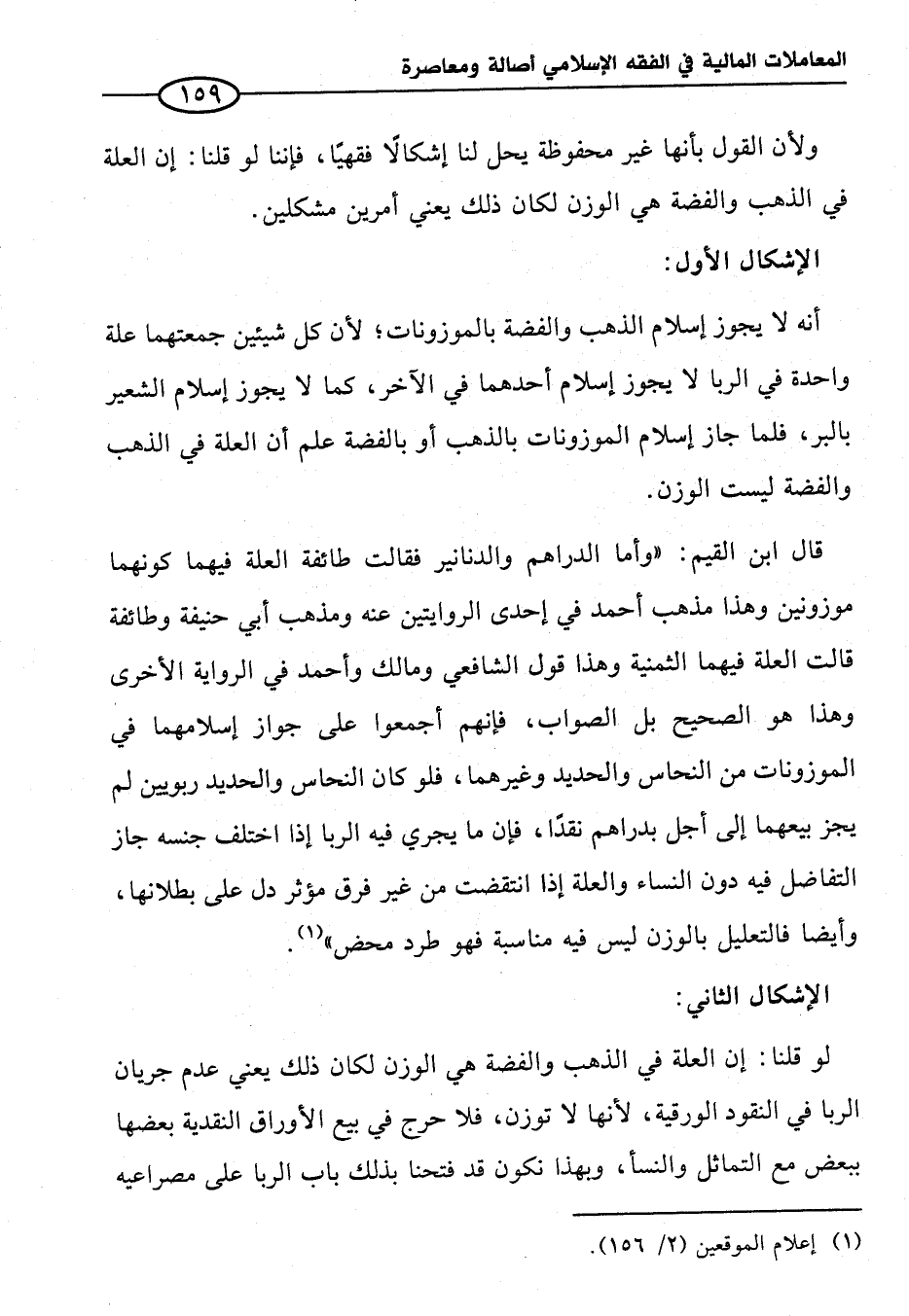 قال ابن القيم: "وأما الدراهم والدنانير فقالت طائفة العلة فيهما كونهما موزونين وهذا مذهب أحمد في إحدى الروايتين عنه ومذهب أبي حنيفة وطائفة قالت العلة فيهما الثمنية وهذا قول الشافعي ومالك وأحمد في الرواية الأخرى وهذا هو الصحيح بل الصواب، فإنهم أجمعوا على جواز إسلامهما في الموزونات من النحاس والحديد وغيرهما، فلو كان النحاس والحديد ربويين لم يجز بيعهما إلى أجل بدراهم نقدًا، فإن ما يجري فيه الربا إذا اختلف جنسه جاز التفاضل فيه دون النساء والعلة إذا انتقضت من غير فرق مؤثر دل على بطلانها، وأيضاً فالتعليل بالوزن ليس فيه مناسبة فهو طرد محض" (¬١).