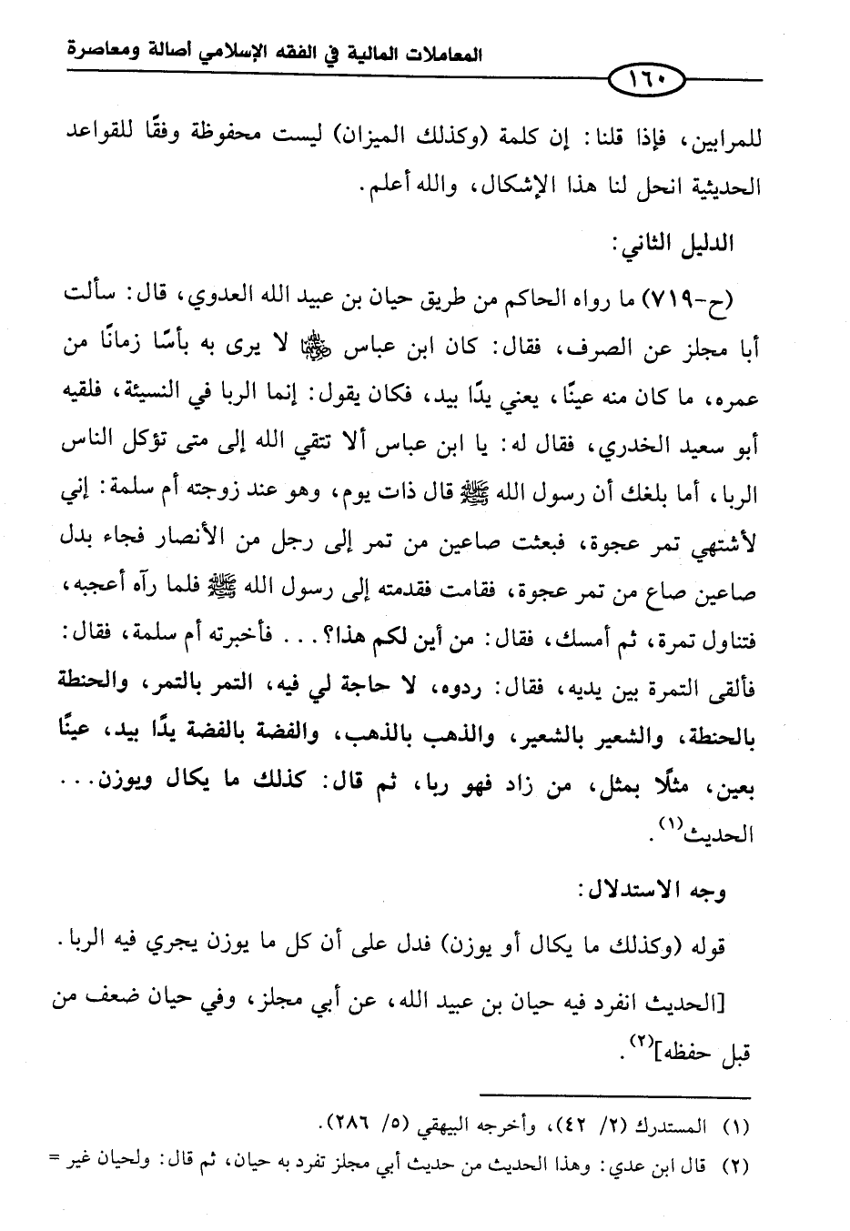 (ح-٧١٩) ما رواه الحاكم من طريق حيان بن عبيد الله العدوي، قال: سألت أبا مجلز عن الصرف، فقال: كان ابن عباس رضي الله عنهما لا يرى به بأسًا زمانًا من عمره، ما كان منه عينًا، يعني يدًا بيد، فكان يقول: إنما الربا في النسيئة، فلقيه أبو سعيد الخدري، فقال له: يا ابن عباس ألا تتقي الله إلى متى تؤكل الناس الربا، أما بلغك أن رسول الله - صلى الله عليه وسلم - قال ذات يوم، وهو عند زوجته أم سلمة: إني لأشتهي تمر عجوة، فبعثت صاعين من تمر إلى رجل من الأنصار فجاء بدل صاعين صاع من تمر عجوة، فقامت فقدمته إلى رسول الله - صلى الله عليه وسلم - فلما رآه أعجبه، فتناول تمرة، ثم أمسك، فقال: من أين لكم هذا؟ ... فأخبرته أم سلمة، فقال: فألقى التمرة بين يديه، فقال: ردوه، لا حاجة لي فيه، التمر بالتمر، والحنطة بالحنطة، والشعير بالشعير، والذهب بالذهب، والفضة بالفضة يدًا بيد، عينًا بعين، مثلًا بمثل، من زاد فهو ربا، ثم قال: كذلك ما يكال ويوزن ... الحديث (¬١).