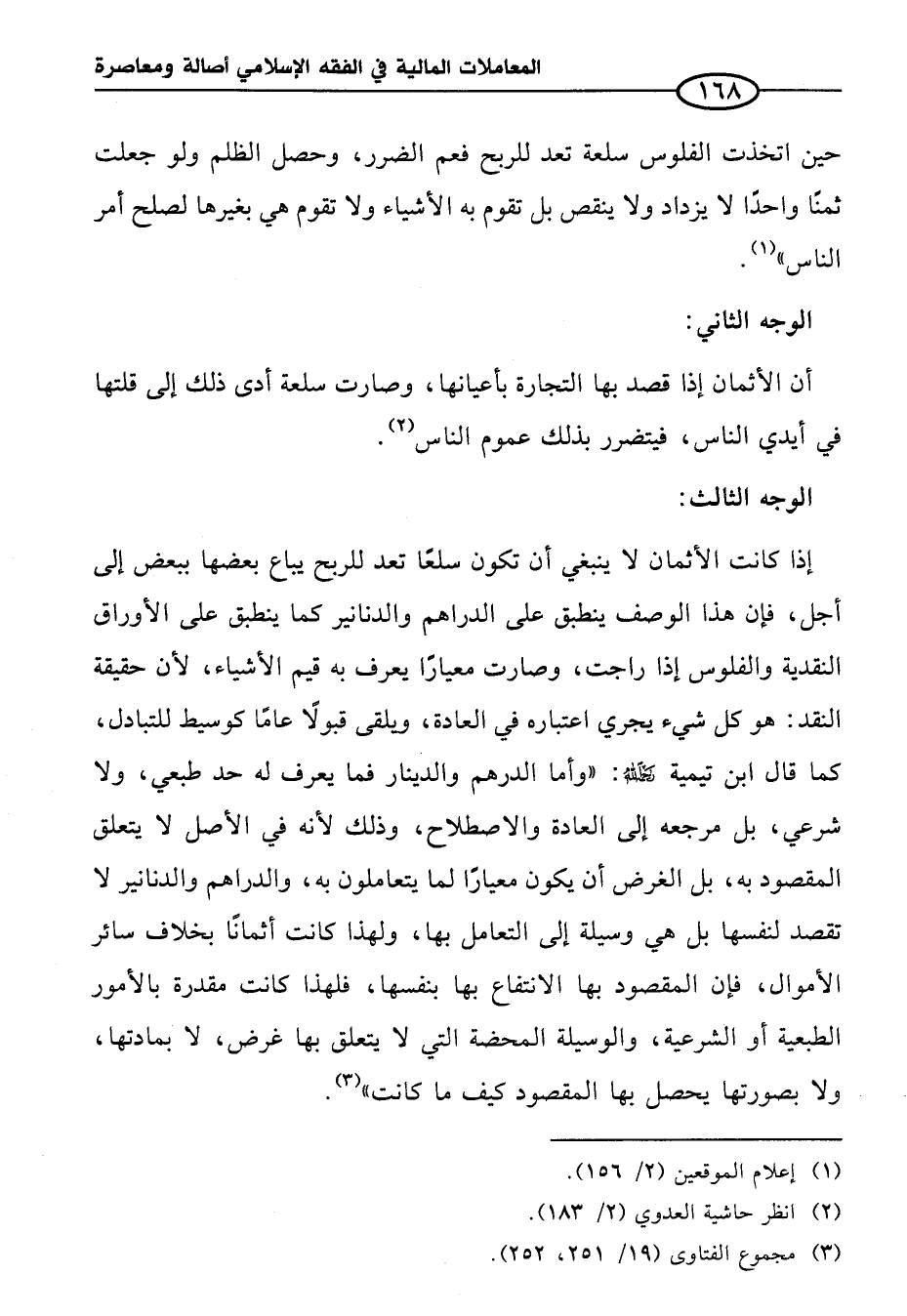 حين اتخذت الفلوس سلعة تعد للربح فعم الضرر، وحصل الظلم ولو جعلت ثمنًا واحداً لا يزداد ولا ينقص بل تقوم به الأشياء ولا تقوم هي بغيرها لصلح أمر الناس" (¬١).