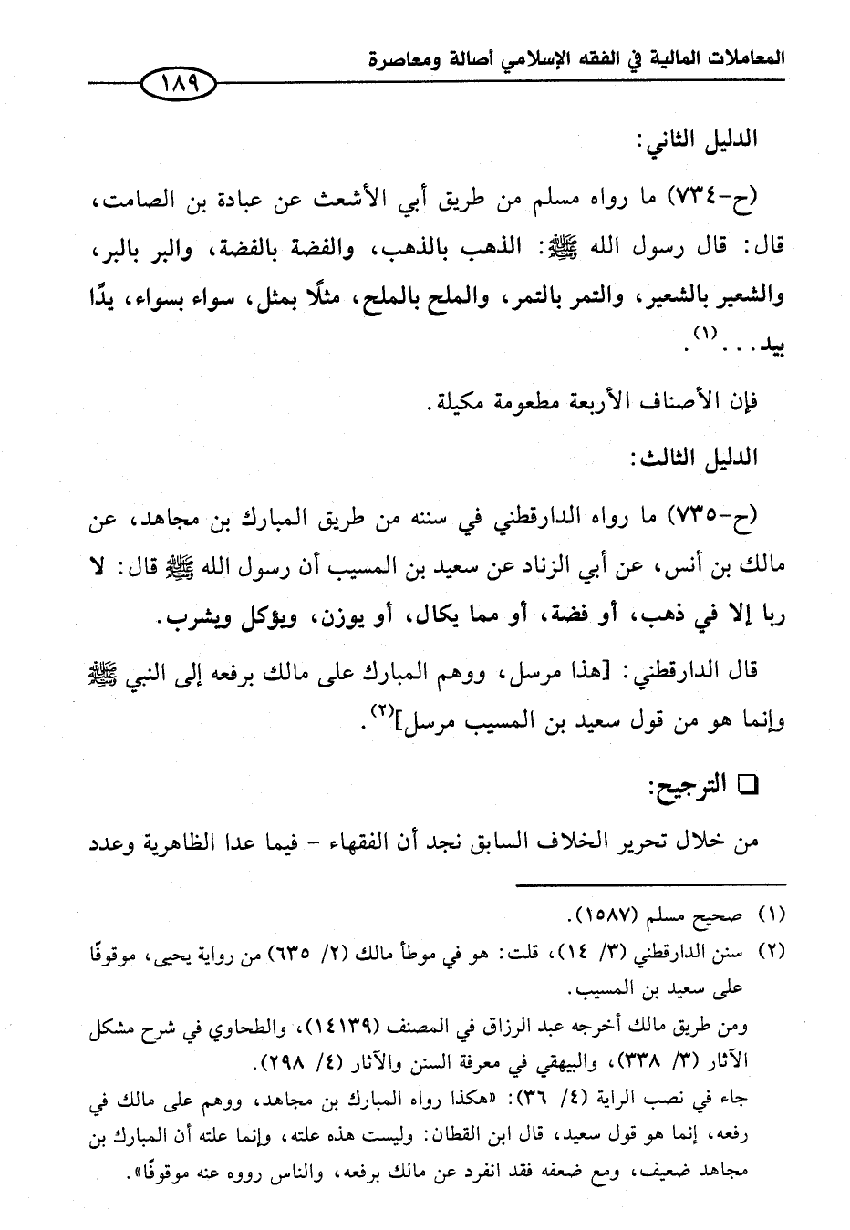 (ح- ٧٣٥) ما رواه الدارقطني في سننه من طريق المبارك بن مجاهد، عن مالك بن أنس، عن أبي الزناد عن سعيد بن المسيب أن رسول الله - صلى الله عليه وسلم - قال: لا ربا إلا في ذهب، أو فضة، أو مما يكال، أو يوزن، ويؤكل ويشرب.