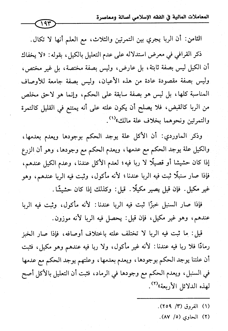 ذكر القرافي في معرض استدلاله على عدم التعليل بالكيل، بقوله: "لا يخفاك أن الكيل ليس بصفة ثابتة، بل عارض، وليس بصفة مختصة، بل غير مختص، وليس بصفة مقصودة عادة من هذه الأعيان، وليس بصفة جامعة للأوصاف المناسبة كلها، بل ليس هو بصفة سابقة على الحكم، وإنما هو لاحق مخلص من الربا كالقبض، فلا يصلح أن يكون علته على أنه يمتنع في القليل كالتمرة والتمرتين ونحوهما بخلاف علة مالك" (¬١).