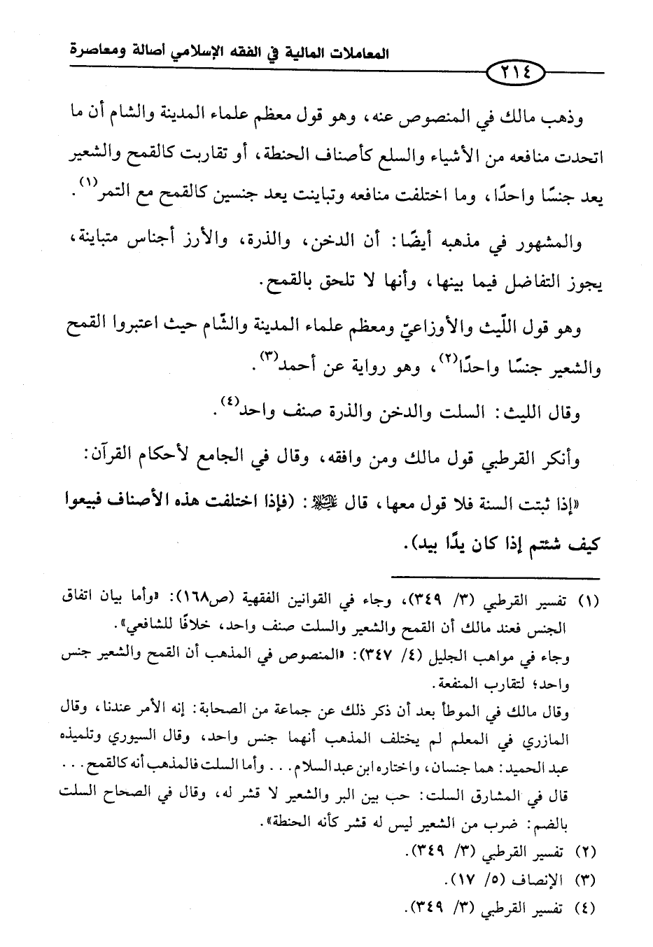 (¬١) تفسير القرطبي (٣/ ٣٤٩)، وجاء في القوانين الفقهية (ص ١٦٨): "وأما بيان اتفاق الجنس فعند مالك أن القمح والشعير والسلت صنف واحد، خلافًا للشافعي".