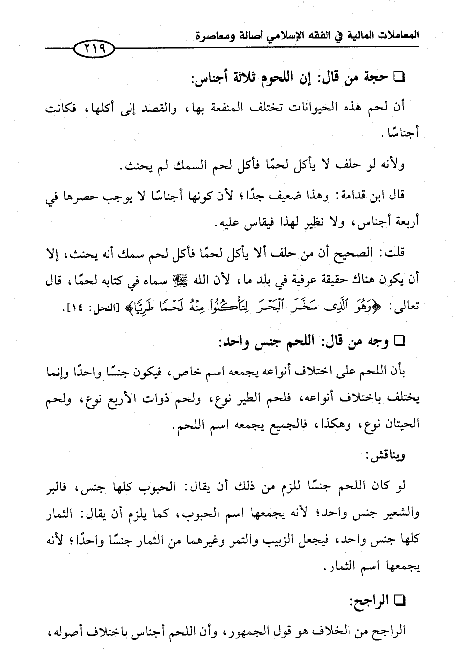 بأن اللحم على اختلاف أنواعه يجمعه اسم خاص، فيكون جنسًا واحداً وإنما يختلف باختلاف أنواعه، فلحم الطير نوع، ولحم ذوات الأربع نوع، ولحم الحيتان نوع، وهكذا، فالجميع يجمعه اسم اللحم.