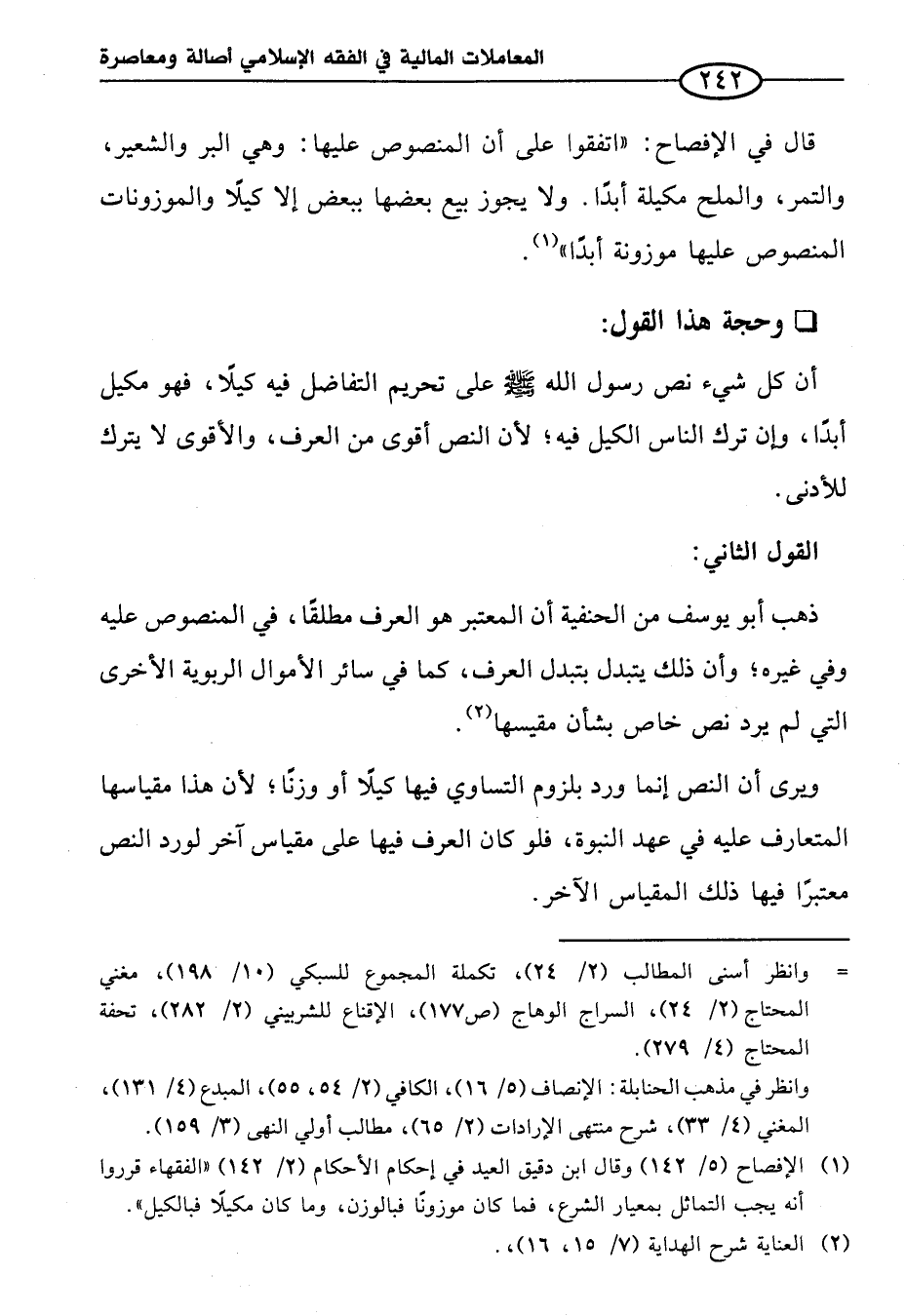 (¬١) الإفصاح (٥/ ١٤٢) وقال ابن دقيق العيد في إحكام الأحكام (٢/ ١٤٢) "الفقهاء قرروا أنه يجب التماثل بمعيار الشرع، فما كان موزونًا فبالوزن، وما كان مكيلًا فبالكيل".