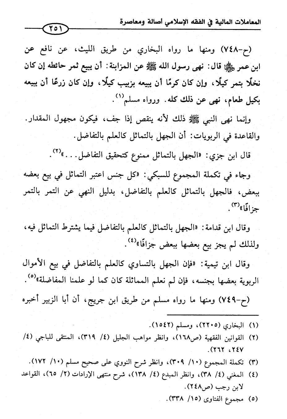 وقال ابن تيمية: "فإن الجهل بالتساوي كالعلم بالتفاضل في بيع الأموال الربوية بعضها بجنسه، فإن لم نعلم المماثلة كان كما لو علمنا المفاضلة" (¬٥).