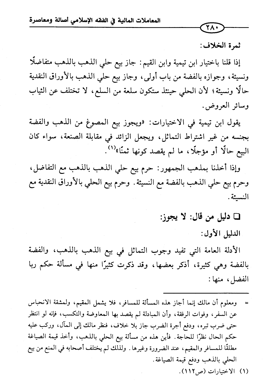 يقول ابن تيمية في الاختيارات: "ويجوز بيع المصوغ من الذهب والفضة بجنسه من غير اشتراط التماثل، ويجعل الزائد في مقابلة الصنعة، سواء كان البيع حالاً أو مؤجلاً، ما لم يقصد كونها ثمنًا" (¬١).
