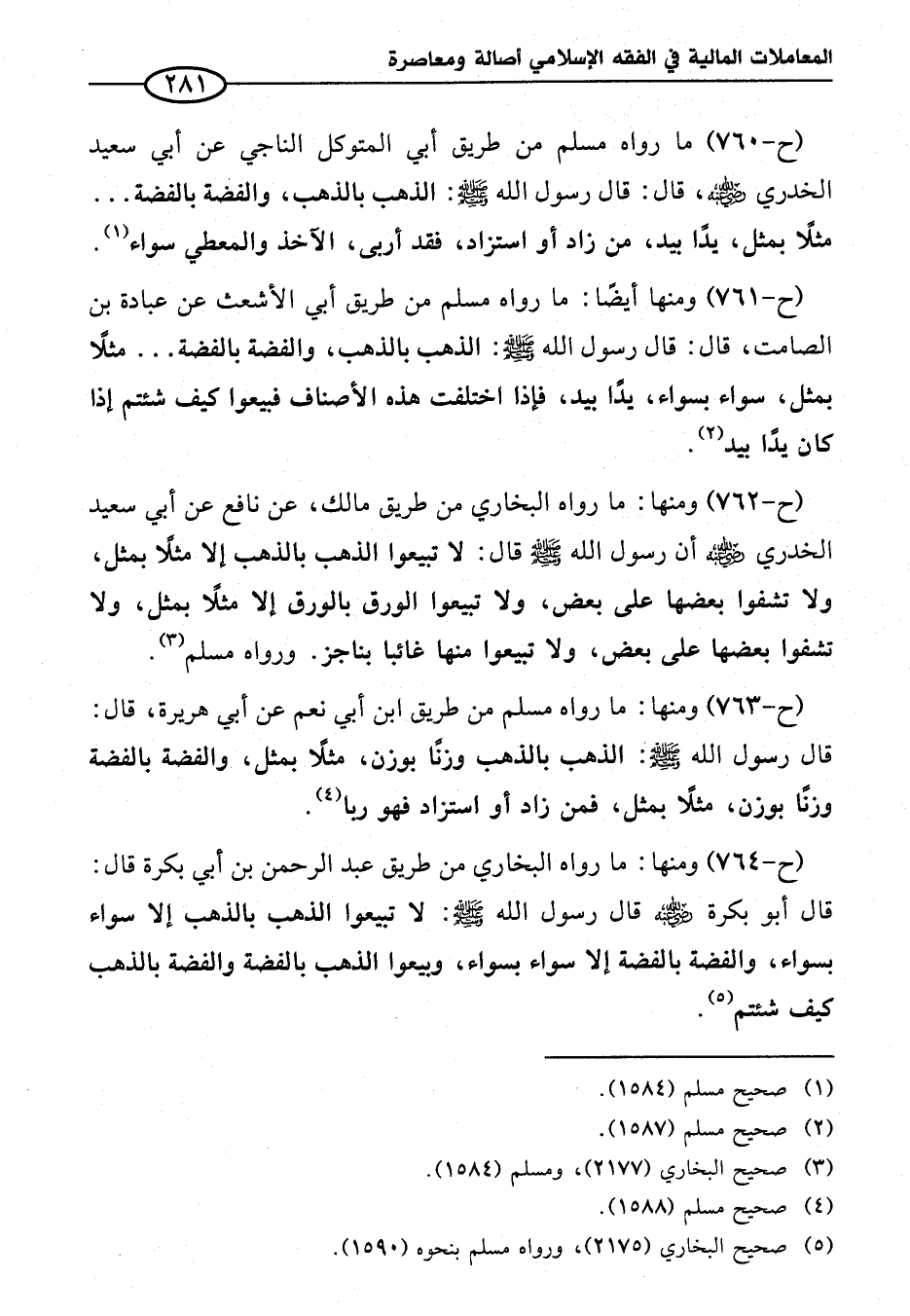 (ح- ٧٦١) ومنها أيضاً: ما رواه مسلم من طريق أبي الأشعث عن عبادة بن الصامت، قال: قال رسول الله - صلى الله عليه وسلم -: الذهب بالذهب، والفضة بالفضة ... مثلاً بمثل، سواء بسواء، يداً بيد، فإذا اختلفت هذه الأصناف فبيعوا كيف شئتم إذا كان يداً بيد (¬٢).