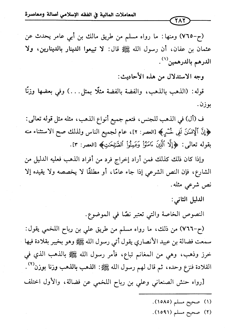 (ح-٧٦٥) ومنها: ما رواه مسلم من طريق مالك بن أبي عامر يحدث عن عثمان بن عفان، أن رسول الله صلى الله عليه وسلم قال: لا تبيعوا الدينار بالدينارين، ولا الدرهم بالدرهمين (¬١).