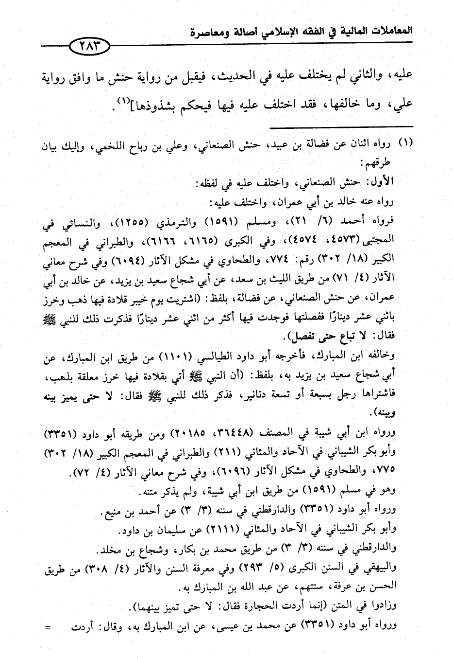 فرواه أحمد (٦/ ٢١)، ومسلم (١٥٩١) والترمذي (١٢٥٥)، والنسائي في المجتبى (٤٥٧٣، ٤٥٧٤)، وفي الكبرى (٦١٦٥، ٦١٦٦)، والطبراني في المعجم الكبير (١٨/ ٣٠٢) رقم: ٧٧٤، والطحاوي في مشكل الآثار (٦٠٩٤) وفي شرح معاني الآثار (٤/ ٧١) من طريق الليث بن سعد، عن أبي شجاع سعيد بن يزيد، عن خالد بن أبي عمران، عن حنش الصنعاني، عن فضالة، بلفظ: (اشتريت يوم خيبر قلادة فيها ذهب وخرز باثني عشر ديناراً ففصلتها فوجدت فيها أكثر من اثني عشر ديناراً فذكرت ذلك للنبي صلى الله عليه وسلم فقال: لا تباع حتى تفصل).
