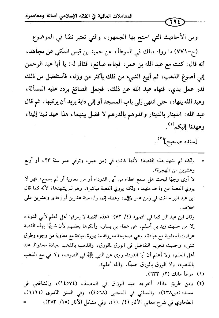 (ح- ٧٧١) ما رواه مالك في الموطأ، عن حميد بن قيس المكي عن مجاهد، أنه قال: كنت مع عبد الله بن عمر، فجاءه صانع، فقال له: يا أبا عبد الرحمن إني أصوغ الذهب، ثم أبيع الشيء من ذلك بأكثر من وزنه، فأستفضل من ذلك قدر عمل يدي، فنهاه عبد الله عن ذلك، فجعل الصائغ يردد عليه المسألة، وعبد الله ينهاه، حتى انتهى إلى باب المسجد أو إلى دابة يريد أن يركبها، ثم قال عبد الله: الدينار بالدينار والدرهم بالدرهم لا فضل بينهما، هذا عهد نبينا إلينا، وعهدنا إليكم (¬١).