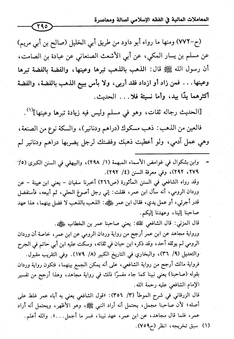 (ح-٧٧٢) ومنها ما رواه أبو داود من طريق أبي الخليل (صالح بن أبي مريم) عن مسلم بن يسار المكي، عن أبي الأشعث الصنعاني عن عبادة بن الصامت، أن رسول الله صلى الله عليه وسلم قال: الذهب بالذهب تبرها وعينها، والفضة بالفضة تبرها وعينها ... فمن زاد أو ازداد فقد أربى، ولا بأس ببيع الذهب بالفضة، والفضة أكثرهما يدًا بيد، وأما نسيئة فلا ... الحديث.