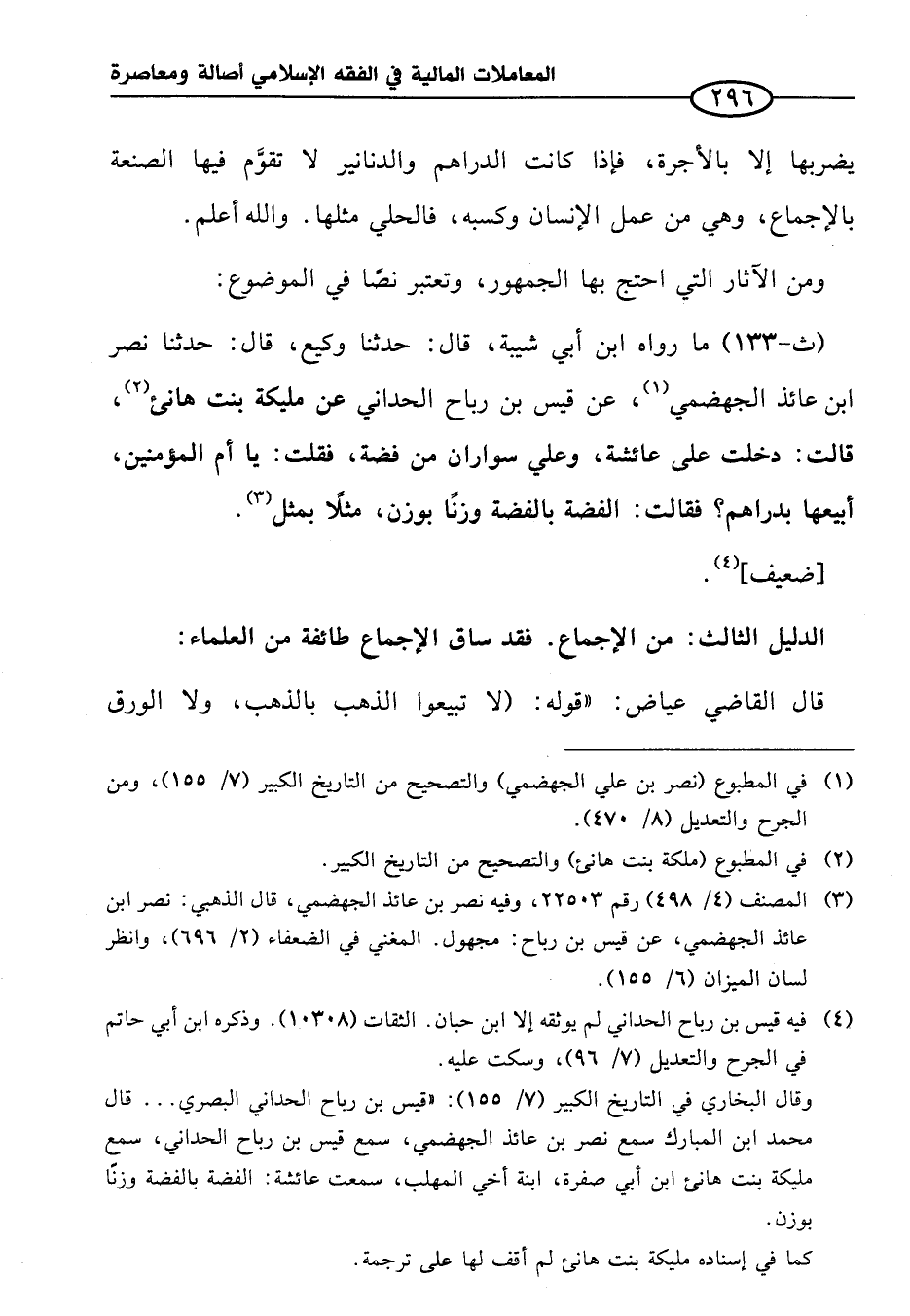 (ث-١٣٣) ما رواه ابن أبي شيبة، قال: حدثنا وكيع، قال: حدثنا نصر ابن عائذ الجهضمي (¬١)، عن قيس بن رباح الحداني عن مليكة بنت هانئ (¬٢)، قالت: دخلت على عائشة، وعلي سواران من فضة، فقلت: يا أم المومنين، أبيعها بدراهم؟ فقالت: الفضة بالفضة وزناً بوزن، مثلاً بمثل (¬٣).