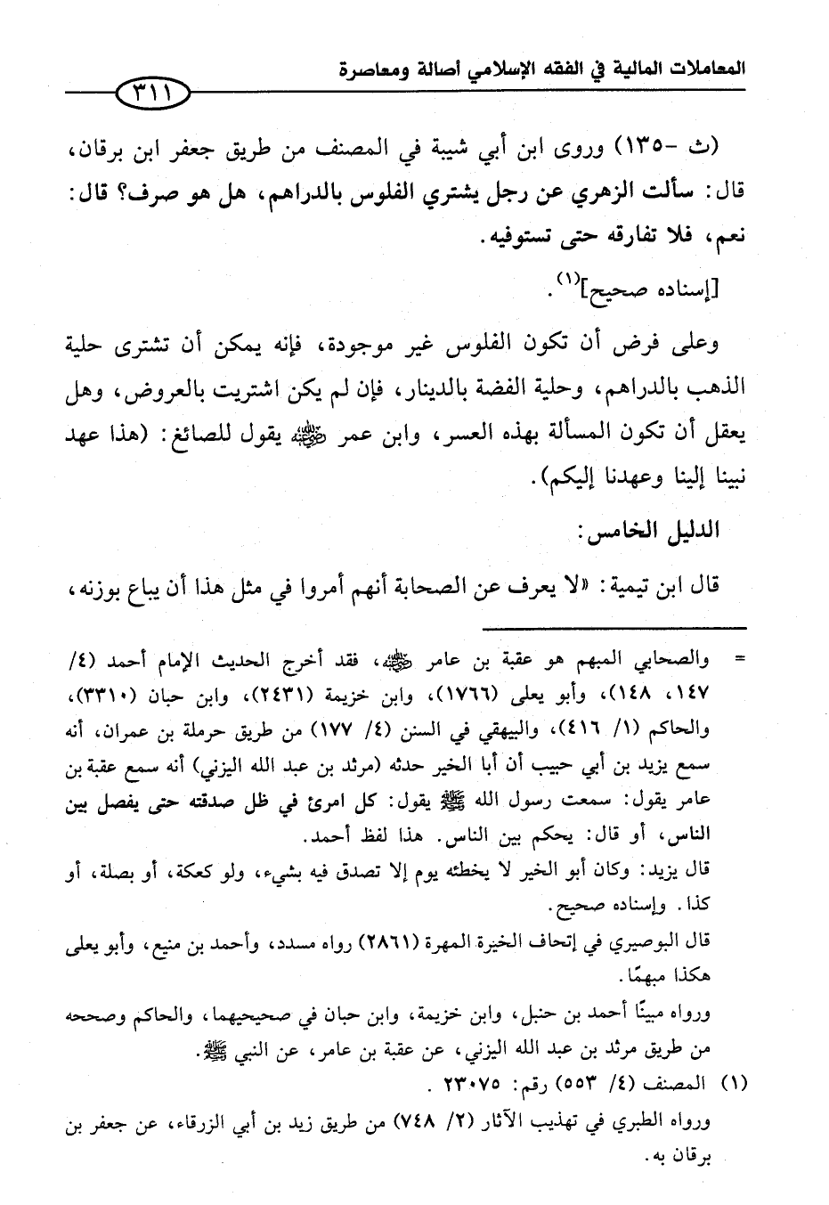 (ث-١٣٥) وروى ابن أبي شيبة في المصنف من طريق جعفر ابن برقان، قال: سألت الزهري عن رجل يشتري الفلوس بالدراهم، هل هو صرف؟ قال: نعم، فلا تفارقه حتى تستوفيه.