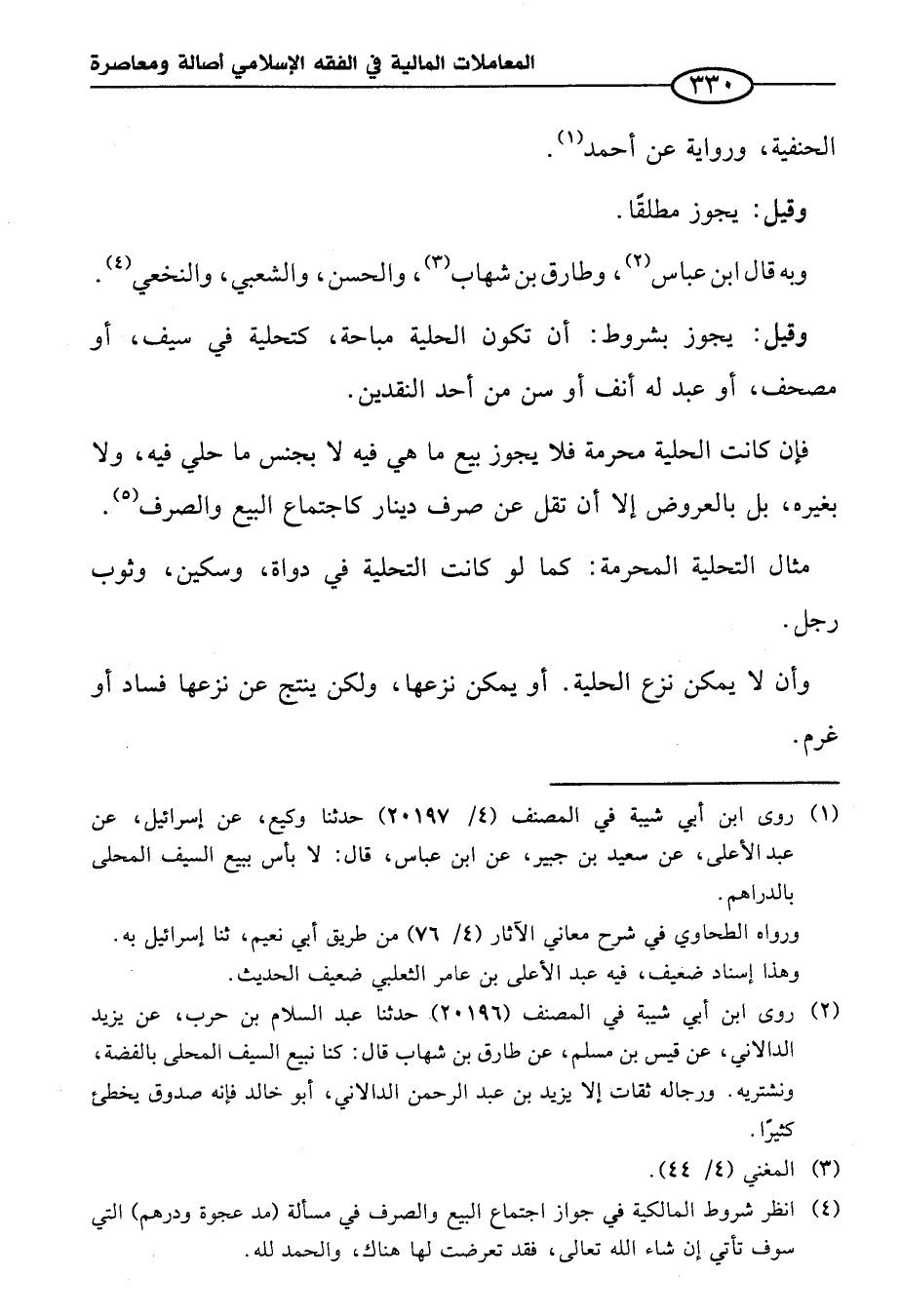 (¬٢) روى ابن أبي شيبة في المصنف (٢٠١٩٦) حدثنا عبد السلام بن حرب، عن يزيد الدالاني، عن قيس بن مسلم، عن طارق بن شهاب قال: كنا نبيع السيف المحلى بالفضة، ونشتريه. ورجاله ثقات إلا يزيد بن عبد الرحمن الدالاني، أبو خالد فإنه صدوق يخطئ كثيراً.
