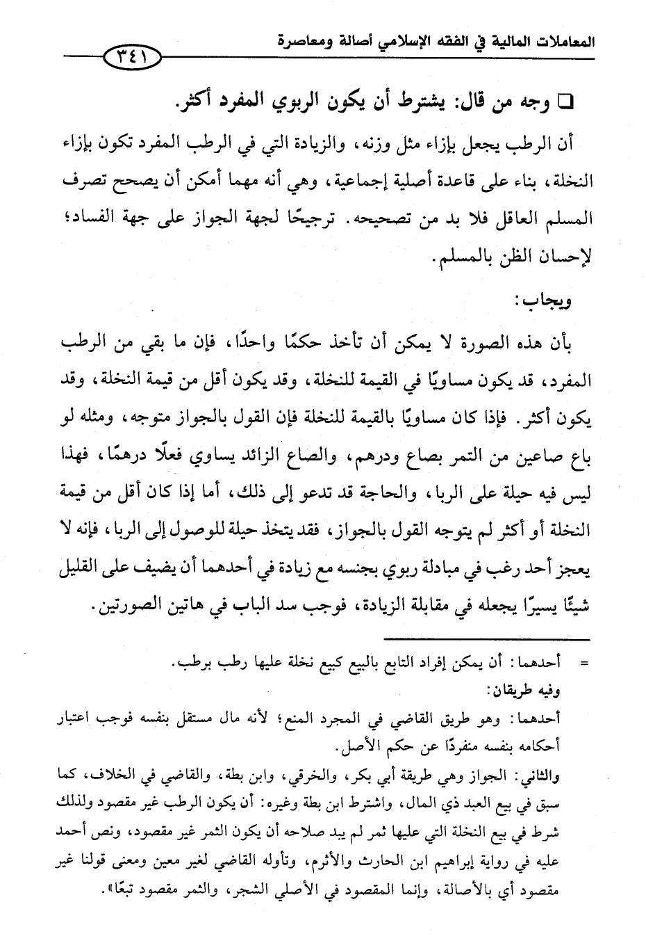 بأن هذه الصورة لا يمكن أن تأخذ حكماً واحداً، فإن ما بقي من الرطب المفرد، قد يكون مساوياً في القيمة للنخلة، وقد يكون أقل من قيمة النخلة، وقد يكون أكثر. فإذا كان مساوياً بالقيمة للنخلة فإن القول بالجواز متوجه، ومثله لو باع صاعين من التمر بصاع ودرهم، والصاع الزائد يساوي فعلاً درهماً، فهذا ليس فيه حيلة على الربا، والحاجة قد تدعو إلى ذلك، أما إذا كان أقل من قيمة النخلة أو أكثر لم يتوجه القول بالجواز، فقد يتخذ حيلة للوصول إلى الربا، فإنه لا يعجز أحد رغب في مبادلة ربوي بجنسه مع زيادة في أحدهما أن يضيف على القليل شيئاً يسيراً يجعله في مقابلة الزيادة، فوجب سد الباب في هاتين الصورتين.