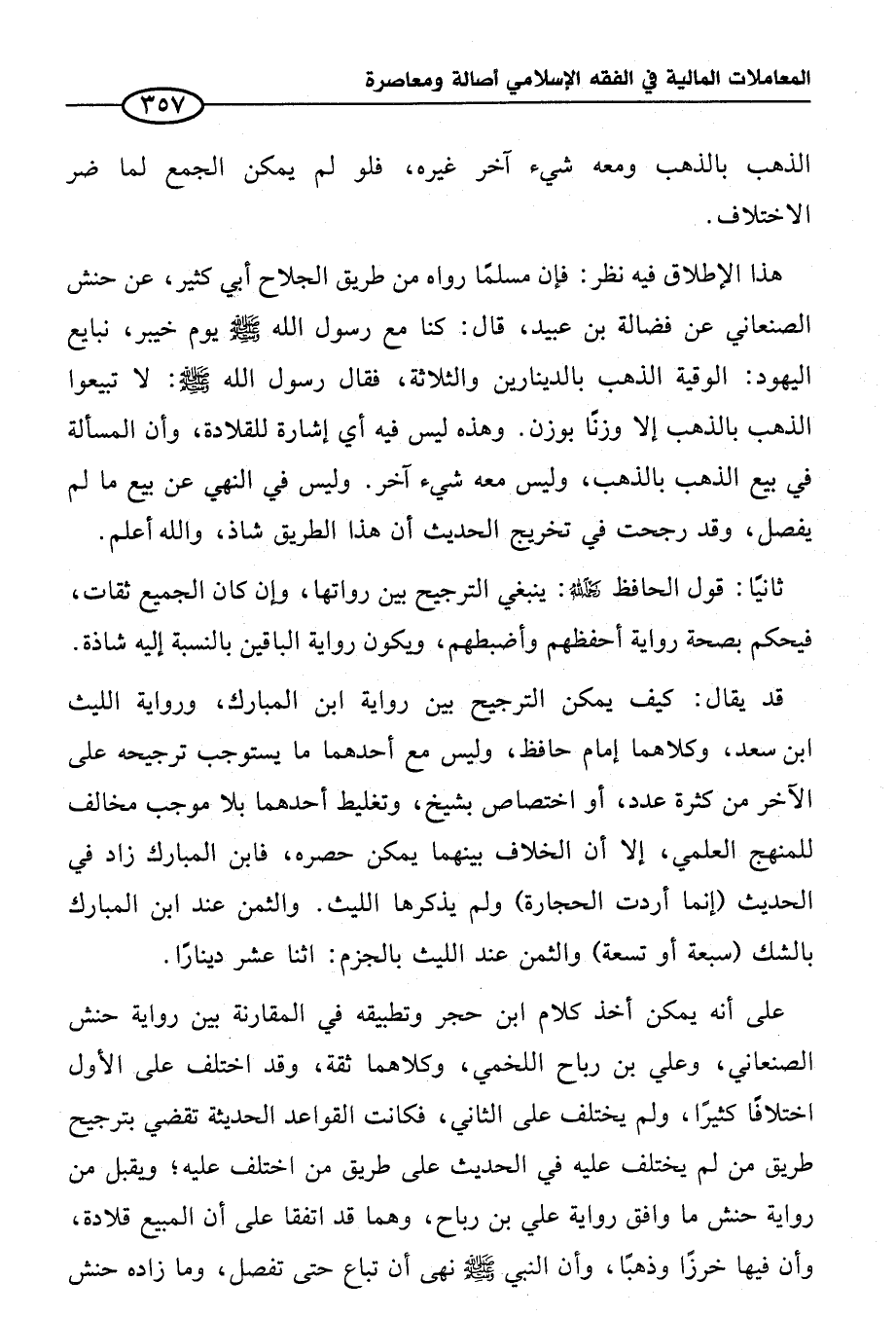 على أنه يمكن أخذ كلام ابن حجر وتطبيقه في المقارنة بين رواية حنش الصنعاني، وعلي بن رباح اللخمي، وكلاهما ثقة، وقد اختلف على الأول اختلافاً كثيراً، ولم يختلف على الثاني، فكانت القواعد الحديثة تقضي بترجيح طريق من لم يختلف عليه في الحديث على طريق من اختلف عليه؛ ويقبل من رواية حنش ما وافق رواية علي بن رباح، وهما قد اتفقا على أن المبيع قلادة، وأن فيها خرزًا وذهباً، وأن النبي صلى الله عليه وسلم نهى أن تباع حتى تفصل، وما زاده حنش