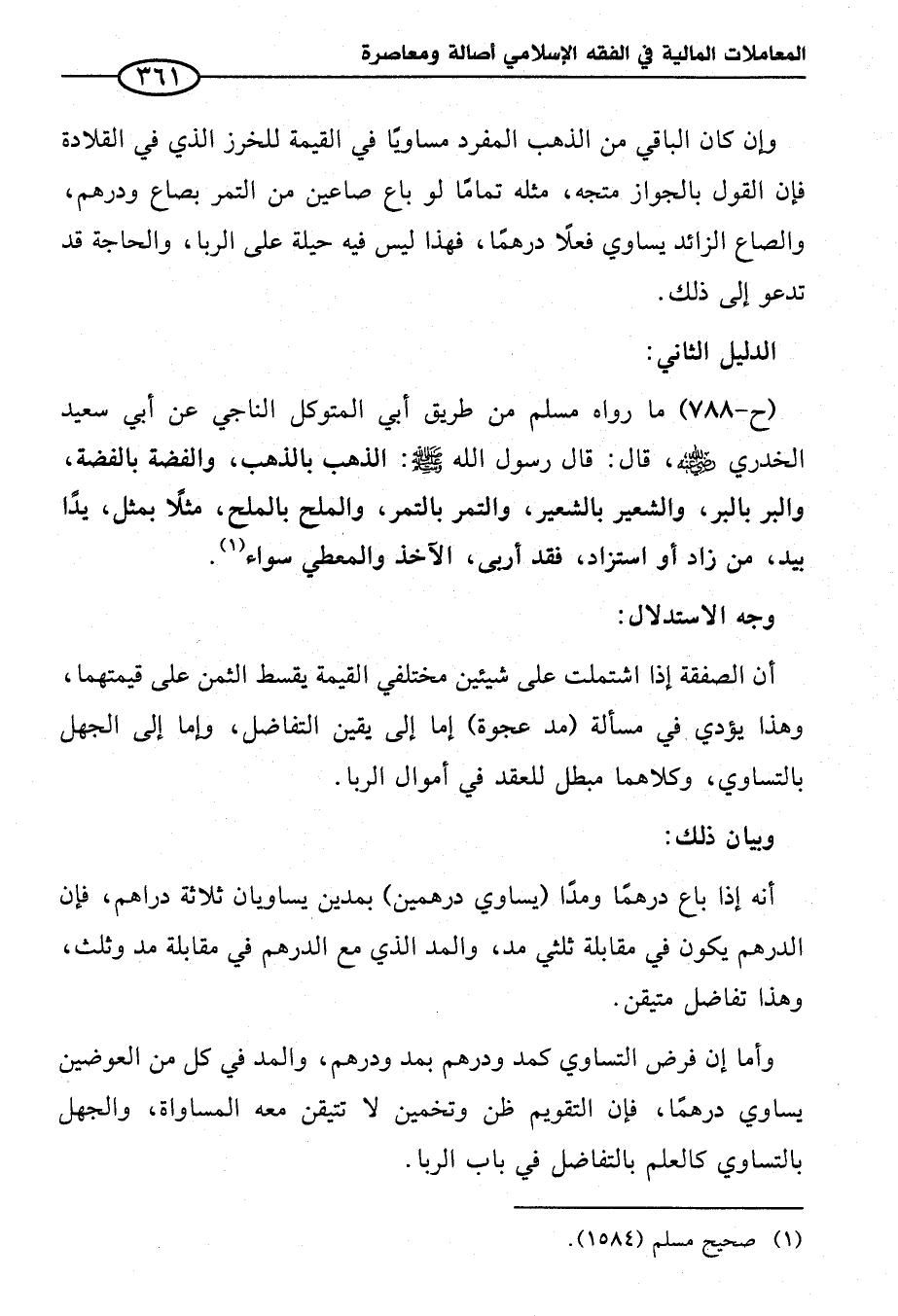 (ح - ٧٨٨) ما رواه مسلم من طريق أبي المتوكل الناجي عن أبي سعيد الخدري رضي الله عنه، قال: قال رسول الله صلى الله عليه وسلم: الذهب بالذهب، والفضة بالفضة، والبر بالبر، والشعير بالشعير، والتمر بالتمر، والملح بالملح، مثلاً بمثل، يداً بيد، من زاد أو استزاد، فقد أربى، الآخذ والمعطي سواء (¬١).
