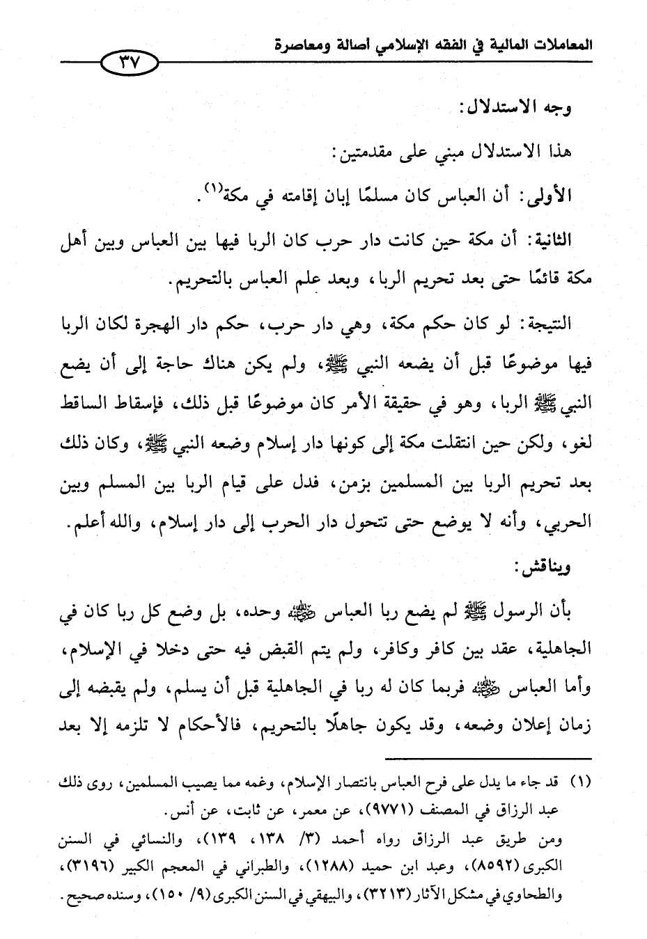 الثاثية: أن مكة حين كانت دار حرب كان الربا فيها بين العباس وبين أهل مكة قائمًا حتى بعد تحريم الربا، وبعد علم العباس بالتحريم.