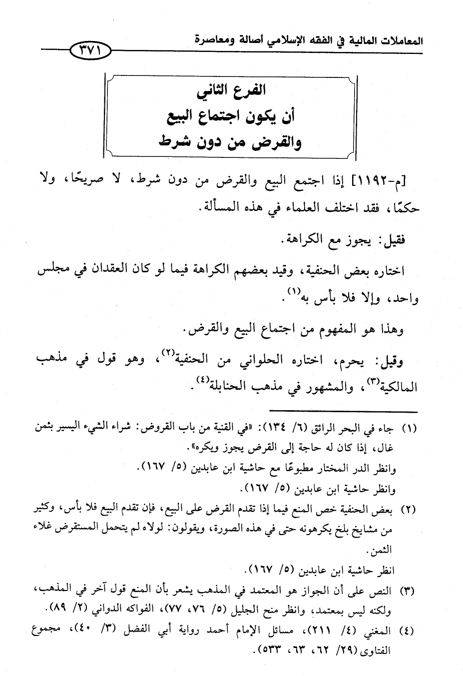 [م - ١١٩٢] إذا اجتمع البيع والقرض من دون شرط، لا صريحاً, ولا حكماً، فقد اختلف العلماء في هذه المسألة.