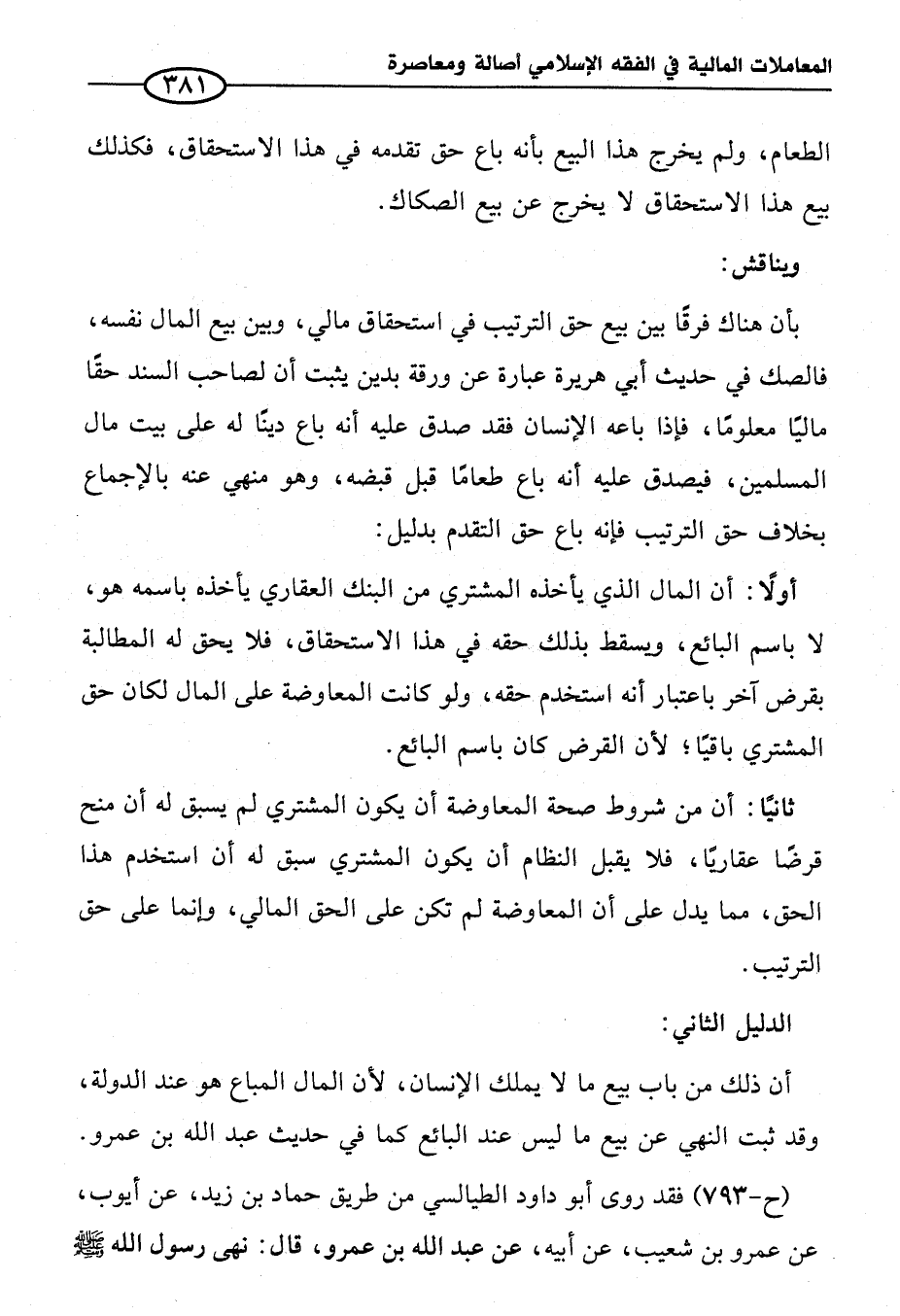 بأن هناك فرقاً بين بيع حق الترتيب في استحقاق مالي، وبين بيع المال نفسه، فالصك في حديث أبي هريرة عبارة عن ورقة بدين يثبت أن لصاحب السند حقاً مالياً معلوماً، فإذا باعه الإنسان فقد صدق عليه أنه باع ديناً له على بيت مال المسلمين، فيصدق عليه أنه باع طعاماً قبل قبضه، وهو منهي عنه بالإجماع بخلاف حق الترتيب فإنه باع حق المتقدم بدليل:
