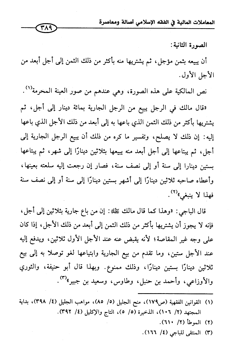 "قال مالك في الرجل يبيع من الرجل الجارية بمائة دينار إلى أجل، ثم يشتريها بأكثر من ذلك الثمن الذي باعها به إلى أبعد من ذلك الأجل الذي باعها إليه: إن ذلك لا يصلح، وتفسير ما كره من ذلك أن يبيع الرجل الجارية إلى أجل، ثم يبتاعها إلى أجل أبعد منه يبيعها بثلاثين ديناراً إلى شهر، ثم يبتاعها بستين دينارا إلى سنة أو إلى نصف سنة، فصار إن رجعت إليه سلعته بعينها، وأعطاه صاحبه ثلاثين ديناراً إلى أشهر بستين دينارًا إلى سنة أو إلى نصف سنة فهذا لا ينبغي" (¬٢).