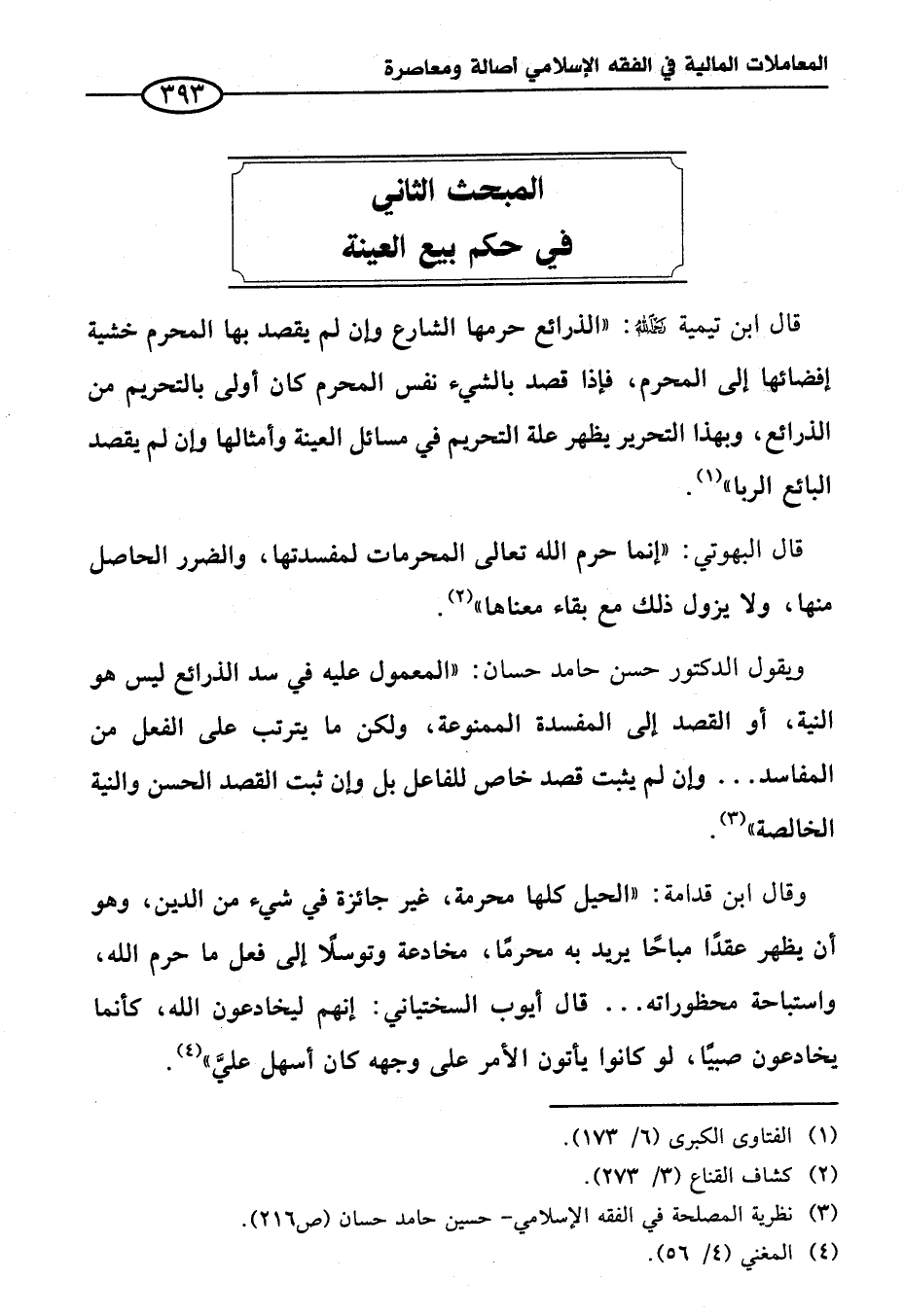 قال ابن تيمية رحمه الله: "الذرائع حرمها الشارع وإن لم يقصد بها المحرم خشية إفضائها إلى المحرم، فإذا قصد بالشيء نفس المحرم كان أولى بالتحريم من الذرائع، وبهذا التحرير يظهر علة التحريم في مسائل العينة وأمثالها وإن لم يقصد البائع الربا" (¬١).