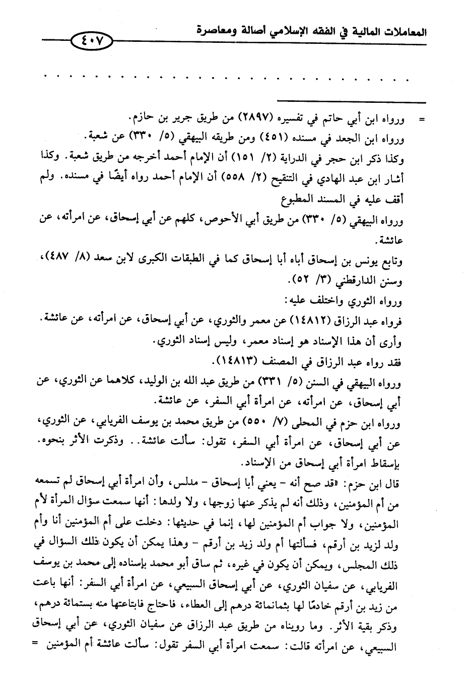 قال ابن حزم: "قد صح أنه -يعني أبا إسحاق- مدلس، وأن امرأة أبي إسحاق لم تسمعه من أم المؤمنين، وذلك أنه لم يذكر عنها زوجها, ولا ولدها: أنها سمعت سؤال المرأة لأم المؤمنين، ولا جواب أم المؤمنين لها، إنما في حديثها: دخلت على أم المؤمنين أنا وأم ولد لزيد بن أرقم، فسألتها أم ولد زيد بن أرقم -وهذا يمكن أن يكون كذلك السؤال في ذلك المجلس، ويمكن أن يكون في غيره، ثم ساق أبو محمد بإسناده إلى محمد بن يوسف الفريابي، عن سفيان الثوري، عن أبي إسحاق السبيعي، عن امرأة أبي السفر: أنها باعت من زيد بن أرقم خادماً لها بثمانمائة درهم إلى العطاء، فاحتاج فابتاعتها منه بستمائة درهم، وذكر بقية الأثر. وما رويناه من طريق عبد الرزاق عن سفيان الثوري، عن أبي إسحاق السبيعي، عن امرأته قالت: سمعت امرأة أبي السفر تقول: سألت عائشة أم المؤمنين =