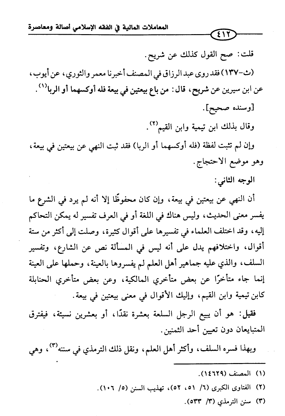 (ث-١٣٧) فقد روى عبد الرزاق في المصنف أخبرنا معمر والثوري، عن أيوب، عن ابن سيرين عن شريح، قال: من باع بيعتين في بيعة فله أوكسهما أو الربا (¬١).