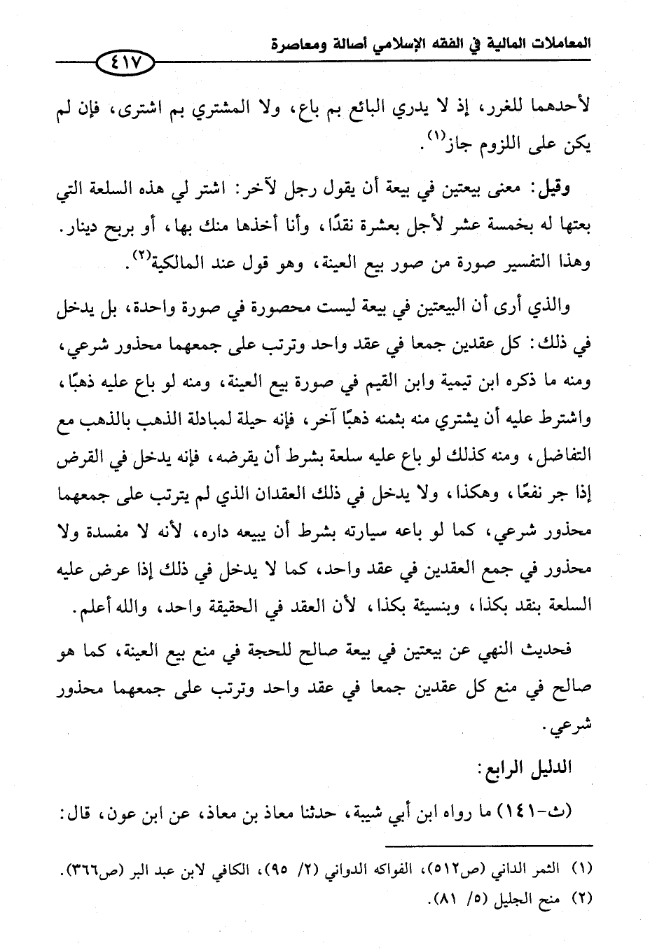 فحديث النهي عن بيعتين في بيعة صالح للحجة في منع بيع العينة، كما هو صالح في منع كل عقدين جمعا في عقد واحد وترتب على جمعهما محذور شرعي.
