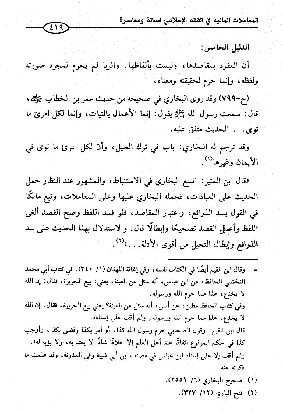 "قال ابن المنير: اتسع البخاري في الاستنباط، والمشهور عند النظار حمل الحديث على العبادات، فحمله البخاري عليها وعلى المعاملات، وتبع مالكاً في القول بسد الذرائع، واعتبار المقاصد، فلو فسد اللفظ وصح القصد ألغي اللفظ وأعمل القصد تصحيحاً وإبطالاً قال: والاستدلال بهذا الحديث على سد الذرائع وإبطال التحيل من أقوى الأدلة ... " (¬٢).