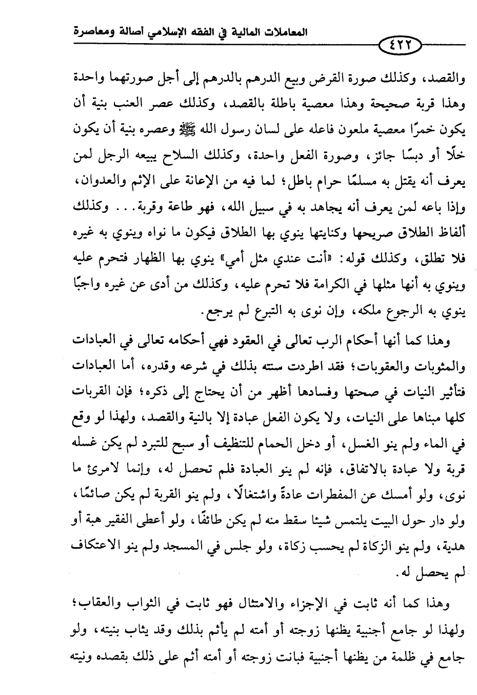 والقصد، وكذلك صورة القرض وبيع الدرهم بالدرهم إلى أجل صورتهما واحدة وهذا قربة صحيحة وهذا معصية باطلة بالقصد، وكذلك عصر العنب بنية أن يكون خمراً معصية ملعون فاعله على لسان رسول الله صلى الله عليه وسلم وعصره بنية أن يكون خلاً أو دبساً جائز، وصورة الفعل واحدة، وكذلك السلاح يبيعه الرجل لمن يعرف أنه يقتل به مسلماً حرام باطل؛ لما فيه من الإعانة على الإثم والعدوان، وإذا باعه لمن يعرف أنه يجاهد به في سبيل الله، فهو طاعة وقربة ... وكذلك ألفاظ الطلاق صريحها وكنايتها ينوي بها الطلاق فيكون ما نواه وينوي به غيره فلا تطلق، وكذلك قوله: "أنت عندي مثل أمي" ينوي بها الظهار فتحرم عليه وينوي به أنها مثلها في الكرامة فلا تحرم عليه، وكذلك من أدى عن غيره واجباً ينوي به الرجوع ملكه، وإن نوى به التبرع لم يرجع.