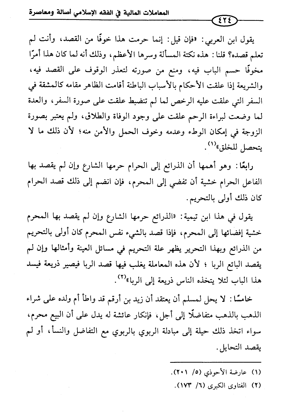 يقول في هذا ابن تيمية: "الذرائع حرمها الشارع وإن لم يقصد بها المحرم خشية إفضائها إلى المحرم، فإذا قصد بالشيء نفس المحرم كان أولى بالتحريم من الذرائع وبهذا التحرير يظهر علة التحريم في مسائل العينة وأمثالها وإن لم يقصد البائع الربا؛ لأن هذه المعاملة يغلب فيها قصد الربا فيصير ذريعة فيسد هذا الباب لئلا يتخذه الناس ذريعة إلى الربا" (¬٢).