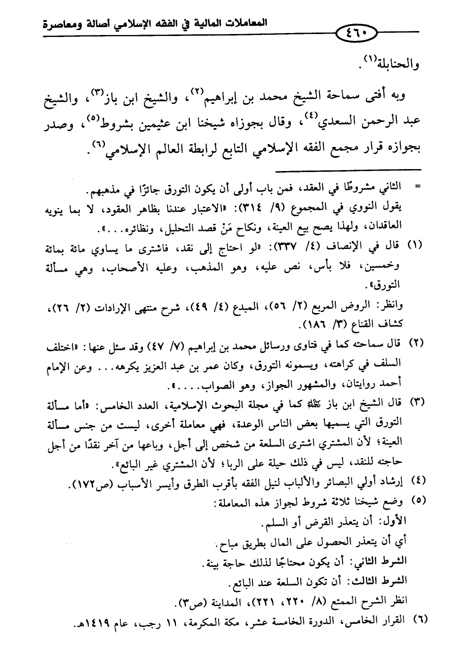 (¬٣) قال الشيخ ابن باز رحمه الله كما في مجلة البحوث الإسلامية، العدد الخامس: "أما مسألة التورق التي يسميها بعض الناس الوعدة، فهي معاملة أخرى، ليست من جنس مسألة العينة؛ لأن المشتري اشترى السلعة من شخص إلى أجل، وباعها من آخر نقداً من أجل حاجته للنقد، ليس في ذلك حيلة على الربا؛ لأن المشتري غير البائع".