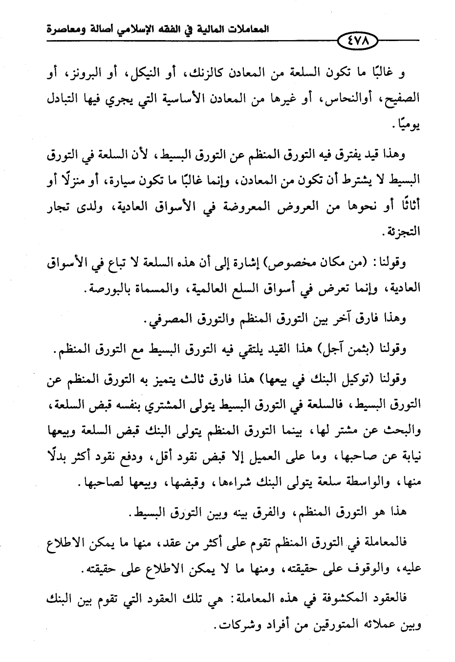 وقولنا (توكيل البنك في بيعها) هذا فارق ثالث يتميز به التورق المنظم عن التورق البسيط، فالسلعة في التورق البسيط يتولى المشتري بنفسه قبض السلعة، والبحث عن مشتر لها، بينما التورق المنظم يتولى البنك قبض السلعة وبيعها نيابة عن صاحبها، وما على العميل إلا قبض نقود أقل، ودفع نقود أكثر بدلًا منها، والواسطة سلعة يتولى البنك شراءها، وقبضها، وبيعها لصاحبها.