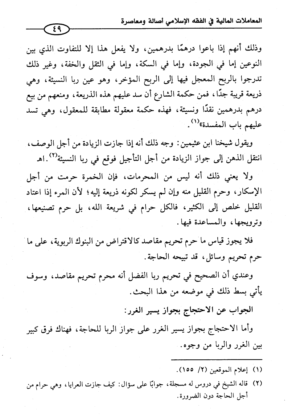 (¬٢) قاله الشيخ في دروس له مسجلة، جوابًا على سؤال: كيف جازت العرايا، وهي حرام من أجل الحاجة دون الضرورة.