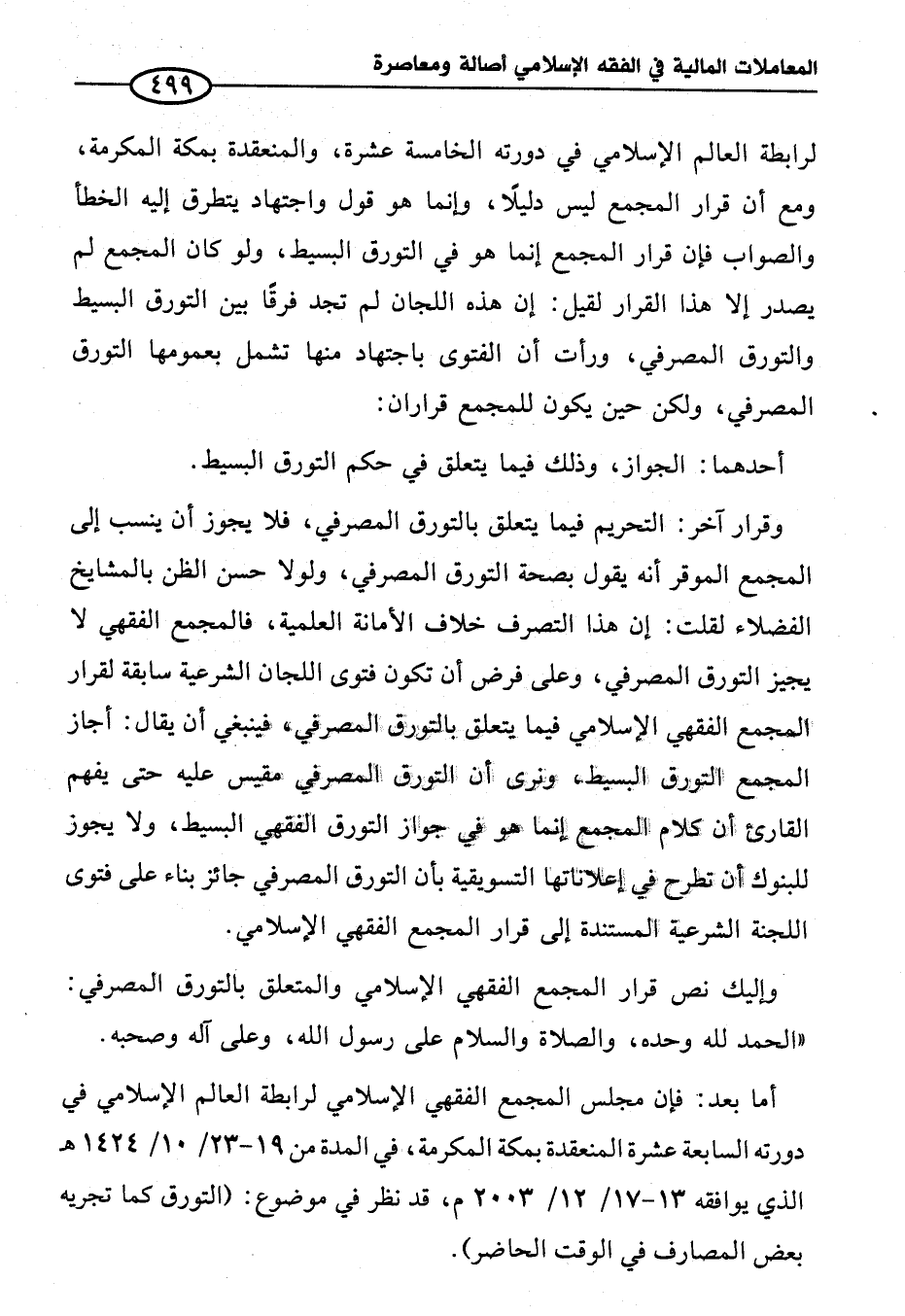وإليك نص قرار المجمع الفقهي الإِسلامي والمتعلق بالتورق المصرفي: "الحمد لله وحده، والصلاة والسلام على رسول الله، وعلى آله وصحبه.