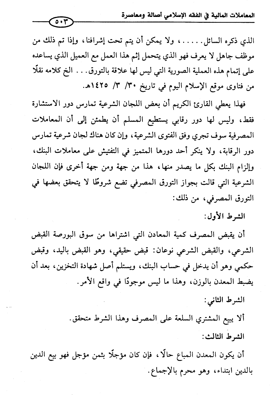 فهذا يعطي القارئ الكريم أن بعض اللجان الشرعية تمارس دور الاستشارة فقط، وليس لها دور رقابي يستطيع المسلم أن يطمئن إلى أن المعاملات المصرفية سوف تجري وفق الفتوى الشرعية، وإن كان هناك لجان شرعية تمارس دور الرقابة، ولا ينكر أحد دورها المتميز في التفتيش على معاملات البنك، وإلزام البنك بكل ما يصدر منها، هذا من جهة ومن جهة أخرى فإن اللجان الشرعية التي قالت بجواز التورق المصرفي تضع شروطًا لا يتحقق بعضها في التورق المصرفي، من ذلك: