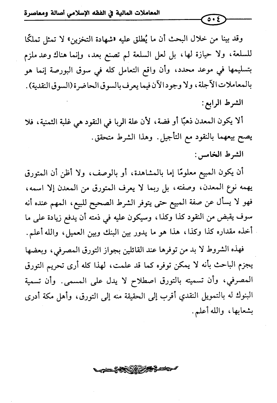 فهذه الشرروط لا بد من توفرها عند القائلين بجواز التورق المصرفي، وبعضها يجزم الباحث بأنه لا يمكن توفره كما قد علمت، لهذا كله أرى تحريم التورق المصرفي، وأن تسميته بالتورق اصطلاح لا يدل على المسمى. وأن تسمية البنوك له بالتمويل النقدي أقرب إلى الحقيقة منه إلى التورق، وأهل مكة أدرى بشعابها، والله أعلم.