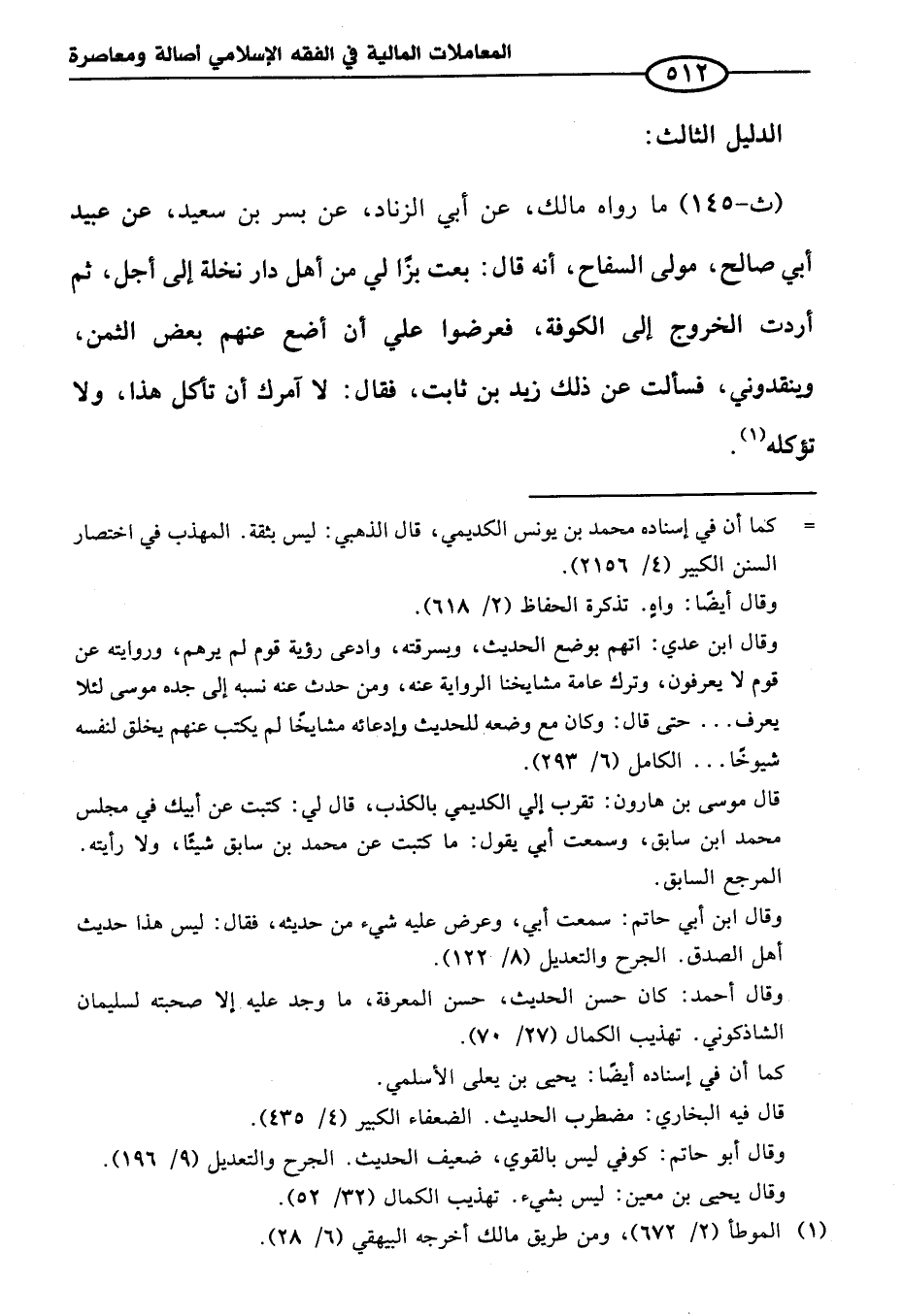 (ث-١٤٥) ما رواه مالك، عن أبي الزناد، عن بسر بن سعيد، عن عبيد أبي صالح، مولى السفاح، أنه قال: بعت بزًّا لي من أهل دار نخلة إلى أجل، ثم أردت الخروج إلى الكوفة، فعرضوا علي أن أضع عنهم بعض الثمن، وينقدوني، فسألت عن ذلك زيد بن ثابت، فقال: لا آمرك أن تأكل هذا، ولا تؤكله (¬١).