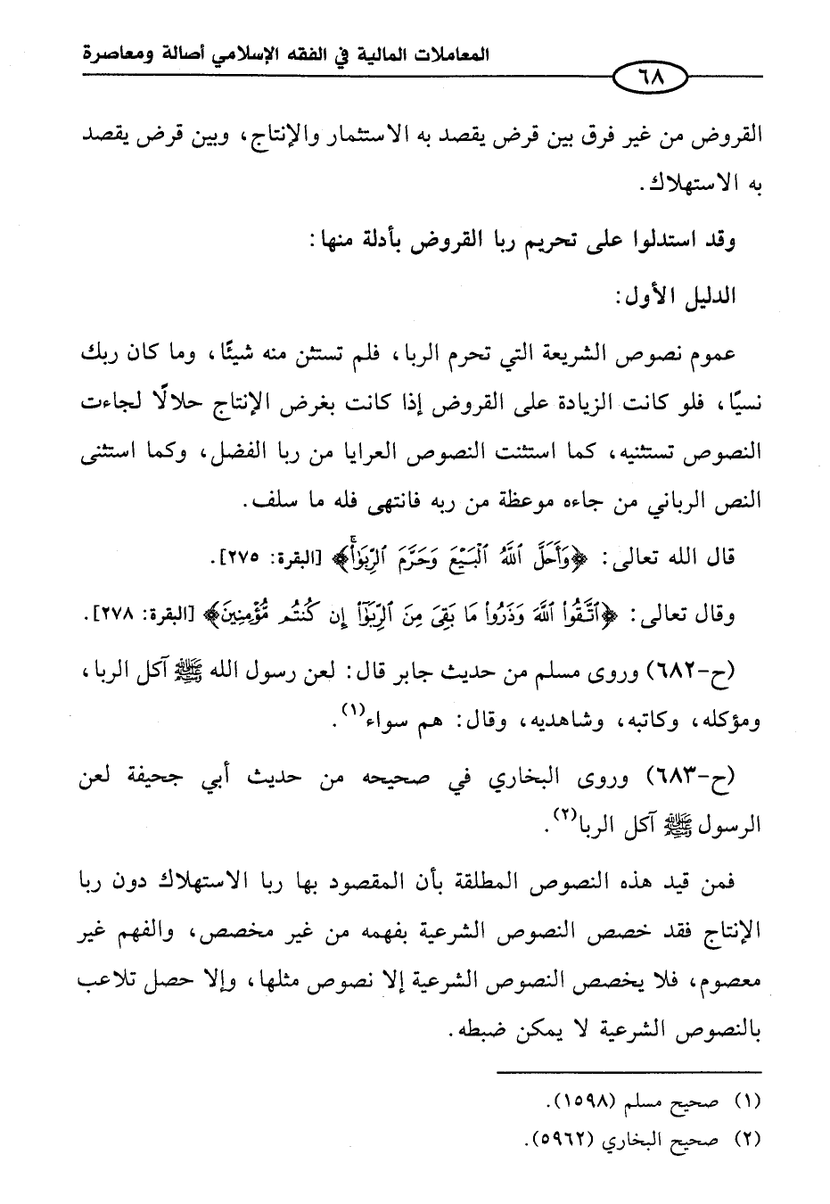 عموم نصوص الشريعة التي تحرم الربا، فلم تستثن منه شيئًا، وما كان ربك نسيًا، فلو كانت الزيادة على القروض إذا كانت بغرض الإنتاج حلالًا لجاءت النصوص تستثنية، كما استثنت النصوص العرايا من ربا الفضل، وكما استثنى النص الرباني من جاءه موعظة من ربه فانتهى فله ما سلف.
