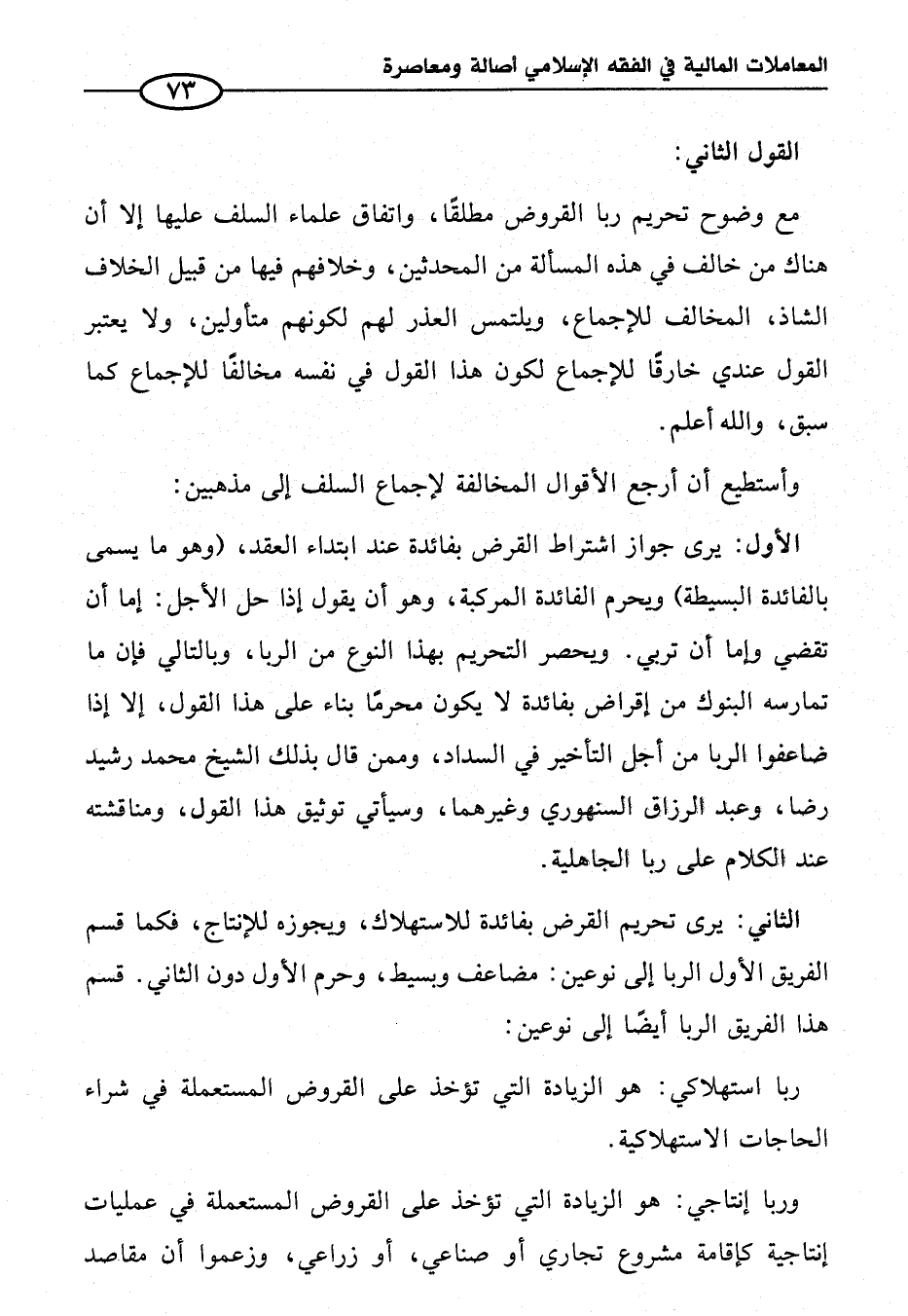الثاني: يرى تحريم القرض بفائدة للاستهلاك، ويجوزه للإنتاج، فكما قسم الفريق الأول الربا إلى نوعين: مضاعف وبسيط، وحرم الأول دون الثاني. قسم هذا الفريق الربا أيضًا إلى نوعين: