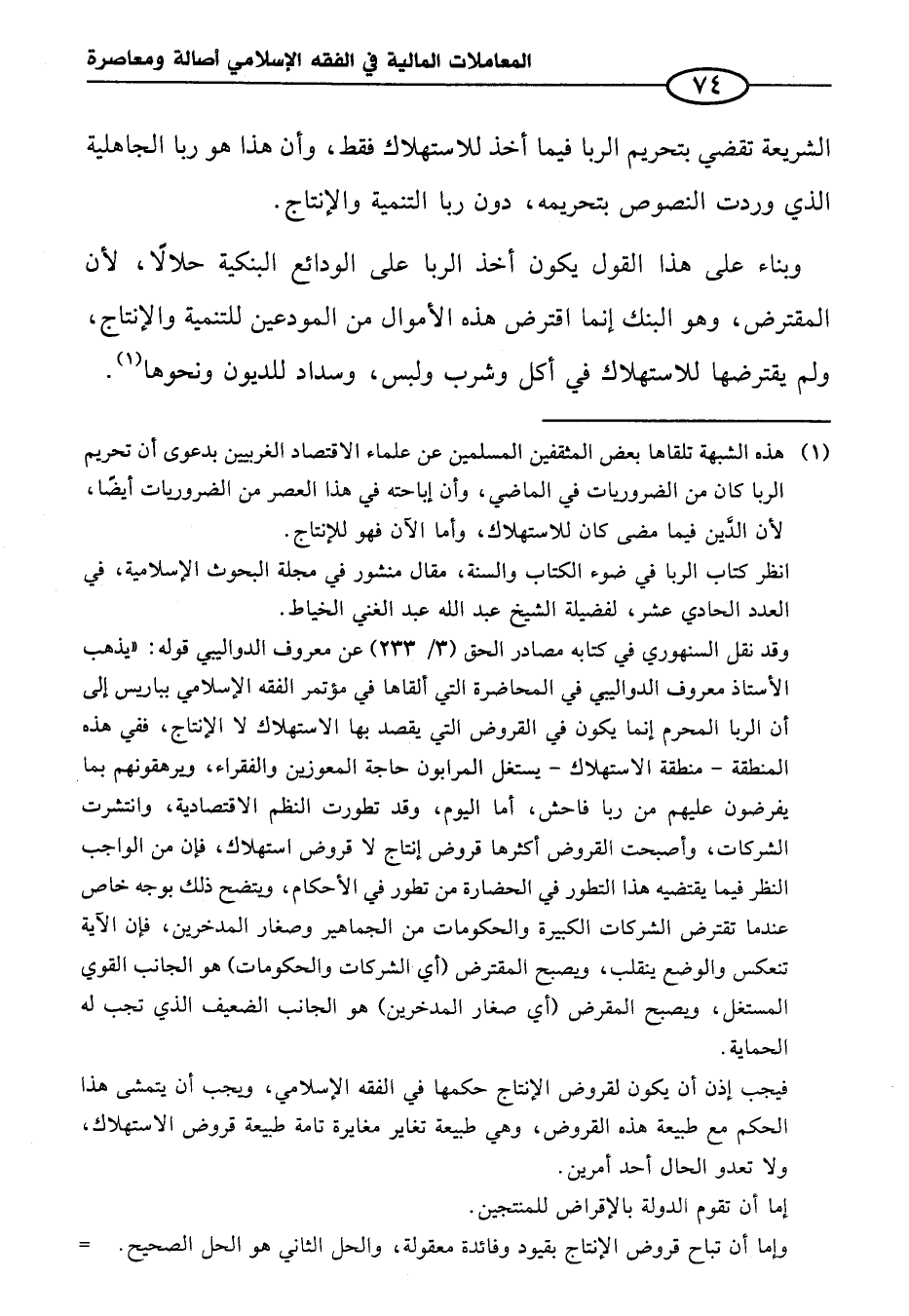 وقد نقل السنهوري في كتابه مصادر الحق (٣/ ٢٣٣) عن معروف الدواليبي قوله: "يذهب الأستاذ معروف الدواليبي في المحاضرة التي ألقاها في مؤتمر الفقه الإِسلامي بباريس إلى أن الربا المحرم إنما يكون في القروض التي يقصد بها الاستهلاك لا الإنتاج، ففي هذه المنطقة -منطقة الاستهلاك- يستغل المرابون حاجة المعوزين والفقراء، ويرهقونهم بما يفرضون عليهم من ربا فاحش، أما اليوم، وقد تطورت النظم الاقتصادية، وانتشرت الشركات، وأصبحت القروض أكثرها قروض إنتاج لا قروض استهلاك، فإن من الواجب النظر فيما يقتضيه هذا التطور في الحضارة من تطور في الأحكام، ويتضح ذلك بوجه خاص عندما تقترض الشركات الكبيرة والحكومات من الجماهير وصغار المدخرين، فإن الآية تنعكس والوضع ينقلب، ويصبح المقترض (أي الشركات والحكومات) هو الجانب القوي المستغل، ويصبح المقرض (أي صغار المدخرين) هو الجانب الضعيف الذي تجب له الحماية.