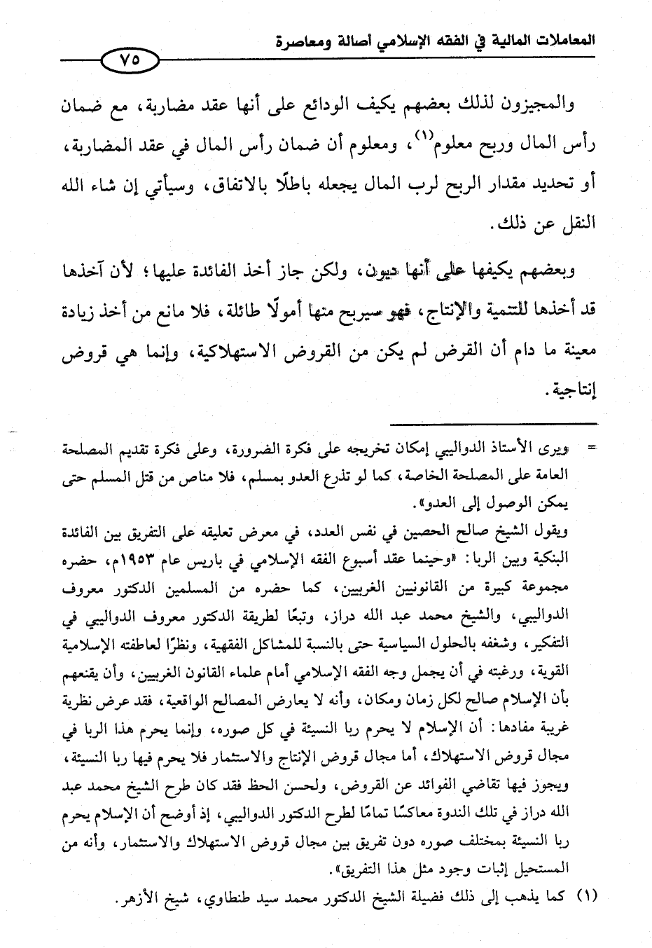 ويقول الشيخ صالح الحصين في نفس العدد، في معرض تعليقه على التفريق بين الفائدة البنكية وبين الربا: "وحينما عقد أسبوع الفقه الإِسلامي في باريس عام ١٩٥٣ م، حضره مجموعة كبيرة من القانونيين الغربيين، كما حضره من المسلمين الدكتور معروف الدواليبي، والشيخ محمَّد عبد الله دراز، وتبعًا لطريقة الدكتور معروف الدواليبي في التفكير، وشغفه بالحلول السياسية حتى بالنسبة للمشاكل الفقهية، ونظرًا لعاطفته الإِسلامية القوية، ورغبته في أن يجمل وجه الفقه الإِسلامي أمام علماء القانون الغربيين، وأن يقنعهم بأن الإِسلام صالح لكل زمان ومكان، وأنه لا يعارض المصالح الواقعية، فقد عرض نظرية غرببة مفادها: أن الإِسلام لا يحرم ربا النسيئة في كل صوره، وإنما يحرم هذا الربا في مجال قروض الاستهلاك، أما مجال قروض الإنتاج والاستثمار فلا يحرم فيها ربا النسيئة، ويجوز فيها تقاضي الفوائد عن القروض، ولحسن الحظ فقد كان طرح الشيخ محمَّد عبد الله دراز في تلك الندوة معاكسًا تمامًا لطرح الدكتور الدواليبي، إذ أوضح أن الإِسلام يحرم ربا النسيئة بمختلف صوره دون تفريق بين مجال قروض الاستهلاك والاستثمار، وأنه من المستحيل إثبات وجود مثل هذا التفريق".
