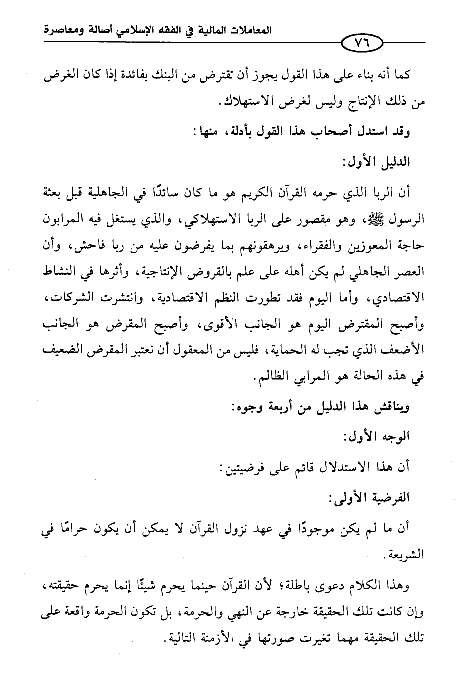 أن الربا الذي حرمه القرآن الكريم هو ما كان سائدًا في الجاهلية قبل بعثة الرسول - صلى الله عليه وسلم -، وهو مقصور على الربا الاستهلاكي، والذي يستغل فيه المرابون حاجة المعوزين والفقراء، ويرهقونهم بما يفرضون عليه من ربا فاحش، وأن العصر الجاهلي لم يكن أهله على علم بالقروض الإنتاجية، وأثرها في النشاط الاقتصادي، وأما اليوم فقد تطورت النظم الاقتصادية، وانتشرت الشركات، وأصبح المقترض اليوم هو الجانب الأقوى، وأصبح المقرض هو الجانب الأضعف الذي تجب له الحماية، فليس من المعقول أن نعتبر المقرض الضعيف في هذه الحالة هو المرابي الظالم.
