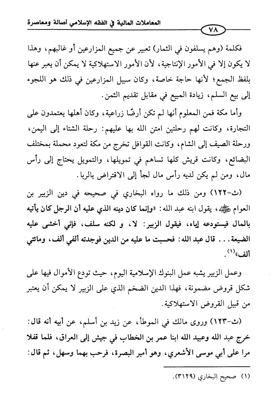 (ث-١٢٢) ومن ذلك ما رواه البخاري في صحيحه في دين الزبير بن العوام - رضي الله عنه -، يقول ابنه عبد الله: "وإنما كان دينه الذي عليه أن الرجل كان يأتيه بالمال فيستودعه إياه، فيقول الزبير: لا، ولكنه سلف، فإني أخشى عليه الضيعة ... قال عبد الله: فحسبت ما عليه من الدين فوجدته ألفي ألف، ومائتي ألف" (¬١).