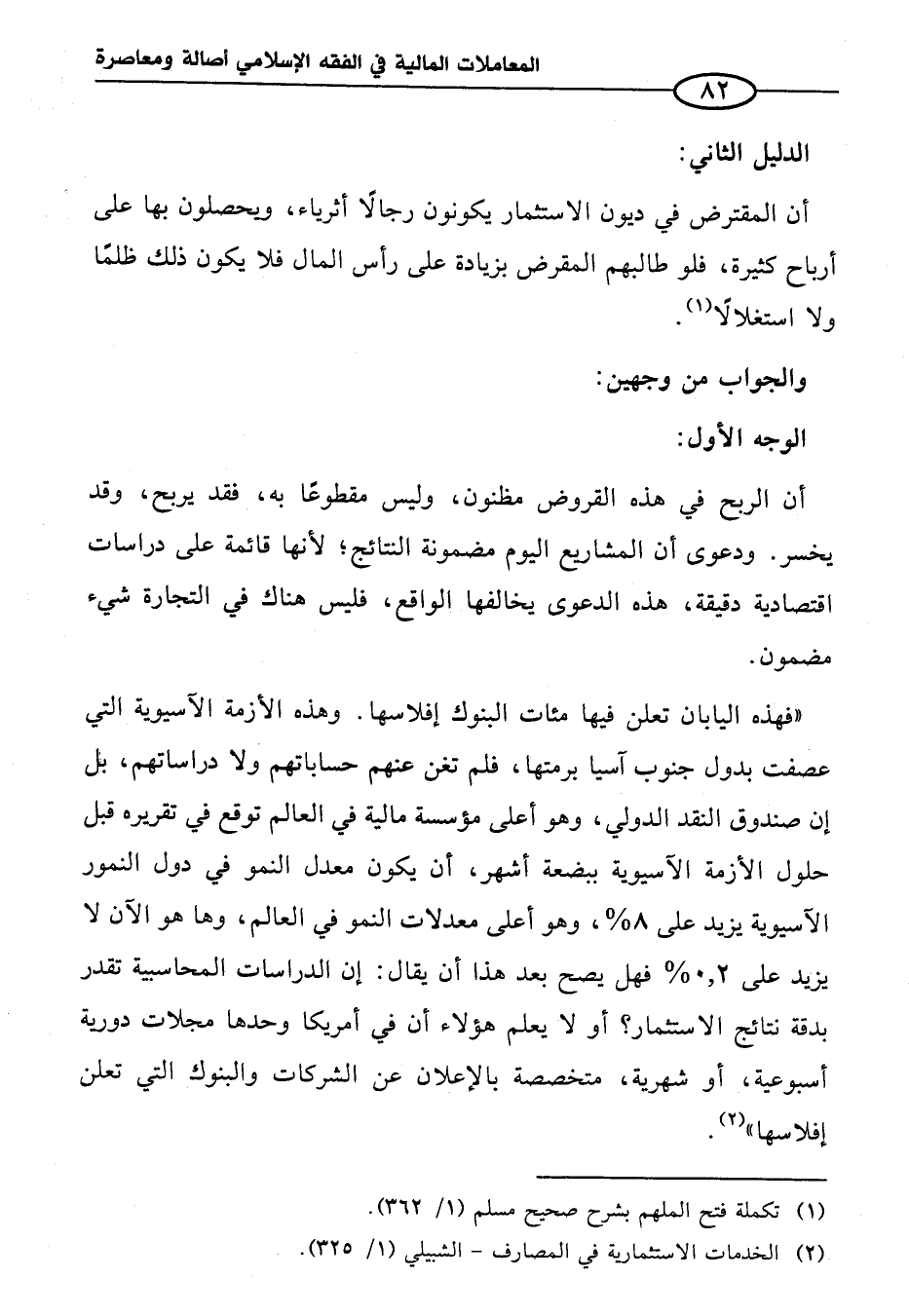 "فهذه اليابان تعلن فيها مئات البنوك إفلاسها. وهذه الأزمة الآسيوية التي عصفت بدول جنوب آسيا برمتها، فلم تغن عتهم حساباتهم ولا دراساتهم، بل إن صندوق النقد الدولي، وهو أعلى مؤسسة مالية في العالم توقع في تقريره قبل حلول الأزمة الآسيوية ببضعة أشهر، أن يكون معدل النمو في دول النمور الآسيوية يزيد على ٨ %، وهو أعلى معدلات النمو في العالم، وها هو الآن لا يزيد على ٠.٢ % فهل يصح بعد هذا أن يقال: إن الدراسات المحاسبية تقدر بدقة نتائج الاستثمار؟ أو لا يعلم هؤلاء أن في أمريكا وحدها مجلات دورية أسبوعية، أو شهرية، متخصصة بالإعلان عن الشركات والبنوك التي تعلن إفلاسها" (¬٢).