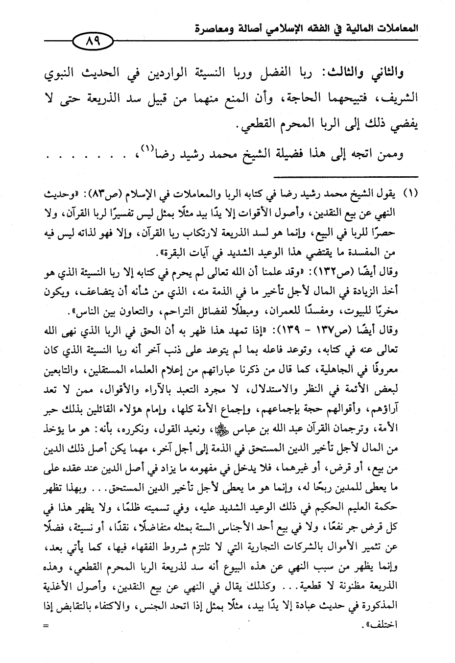 وقال أيضًا (ص ١٣٧ - ١٣٩): "إذا تمهد هذا ظهر به أن الحق في الربا الذي نهى الله تعالى عنه في كتابه، وتوعد فاعله بما لم يتوعد على ذنب آخر أنه ربا النسيئة الذي كان معروفاً في الجاهلية، كما قال من ذكرنا عباراتهم من إعلام العلماء المستقلين، والتابعين لبعض الأئمة في النظر والاستدلال، لا مجرد التعبد بالآراء والأقوال، ممن لا تعد آراؤهم، وأقوالهم حجة بإجماعهم، وإجماع الأمة كلها، وإمام هؤلاء القائلين بذلك حبر الأمة، وترجمان القرآن عبد الله بن عباس رضي الله عنهما، ونعيد القول، ونكرره، بأنه: هو ما يؤخذ من المال لأجل تأخير الدين المستحق في الذمة إلى أجل آخر، مهما يكن أصل ذلك الدين من بيع، أو قرض، أو غيرهما، فلا يدخل في مفهومه ما يزاد في أصل الدين عند عقده على ما يعطى للمدين ربحًا له، وإنما هو ما يعطى لأجل تأخير الدين المستحق ... وبهذا تظهر حكمة العلم الحكيم في ذلك الوعيد الشديد عليه، وفي تسميته ظلمًا, ولا يظهر هذا في كل قرض جر نفعًا, ولا في بيع أحد الأجناس الستة بمثله متفاضلًا، نقدًا، أو نسيئة، فضلًا عن تثمير الأموال بالشركات التجارية التي لا تلتزم شروط الفقهاء فيها، كما يأتي بعد، وإنما يظهر من سبب النهي عن هذه البيوع أنه سد لذريعة الربا المحرم القطعي، وهذه الذريعة مظنونة لا قطعية ... وكذلك يقال في النهي عن بيع النقدين، وأصول الأغذية المذكورة في حديث عبادة إلا يدًا بيد، مثلًا بمثل إذا اتحد الجنس، والاكتفاء بالتقابض إذا اختلف". =