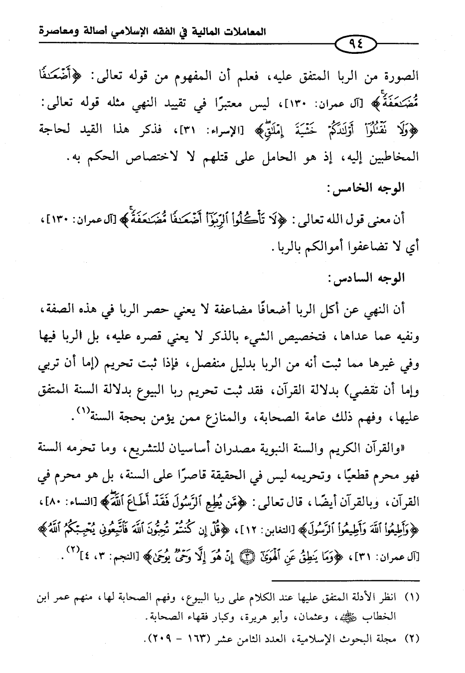 (¬١) انظر الأدلة المتفق عليها عند الكلام على ربا البيوع، وفهم الصحابة لها، منهم عمر ابن الخطاب - رضي الله عنه -، وعثمان، وأبو هريرة، وكبار فقهاء الصحابة.