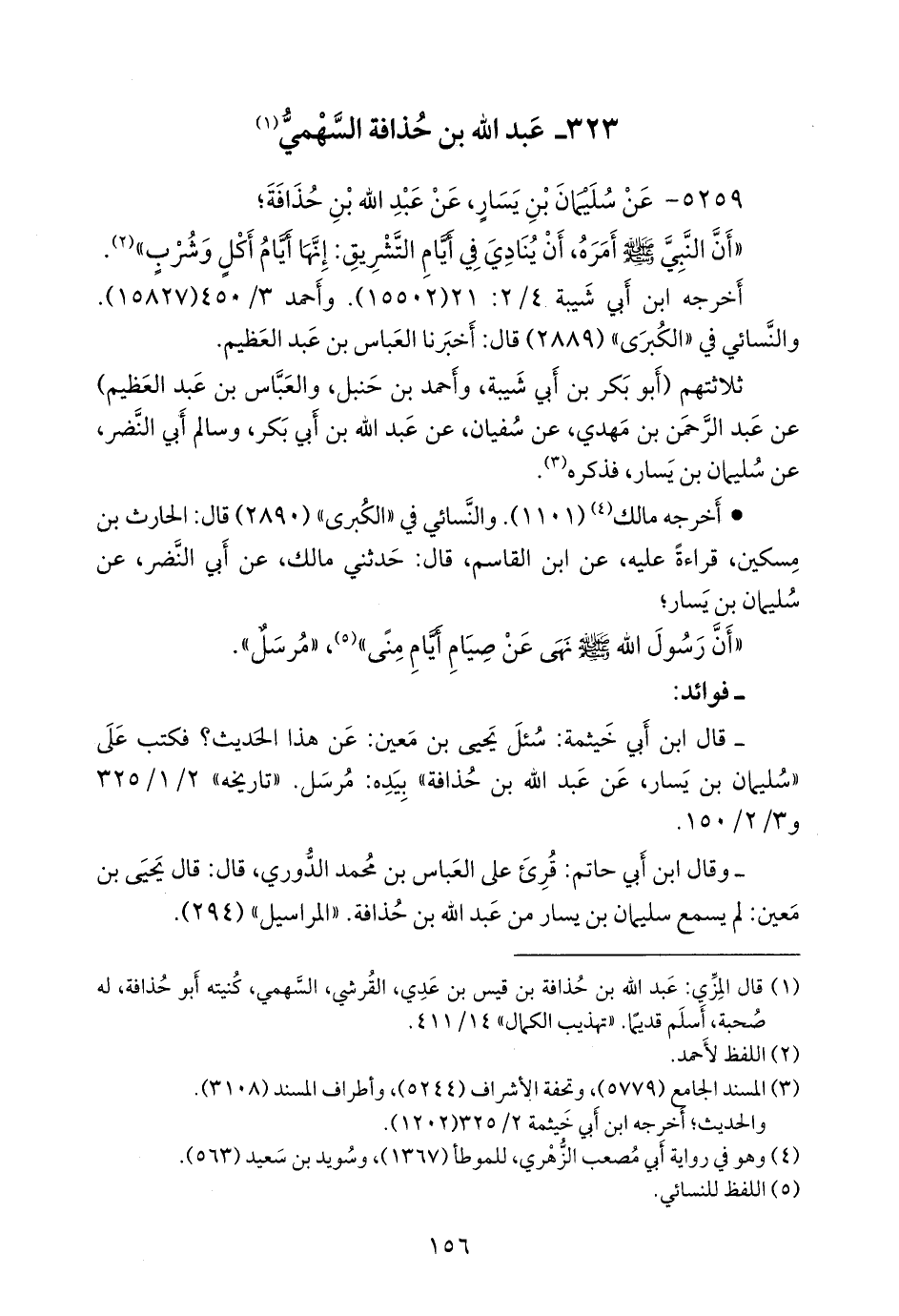 - وقال الأثرم: قلت لأبي عبد الله، أحمد بن حنبل: حديث سفيان، عن أبي النضر، عن سليمان بن يسار، عن عبد الله بن حذافة، في أيام التشريق، سفيان أسنده، وقال مالك بن أنس: إن النبي صَلى الله عَليه وسَلم بعث عبد الله بن حذافة؟